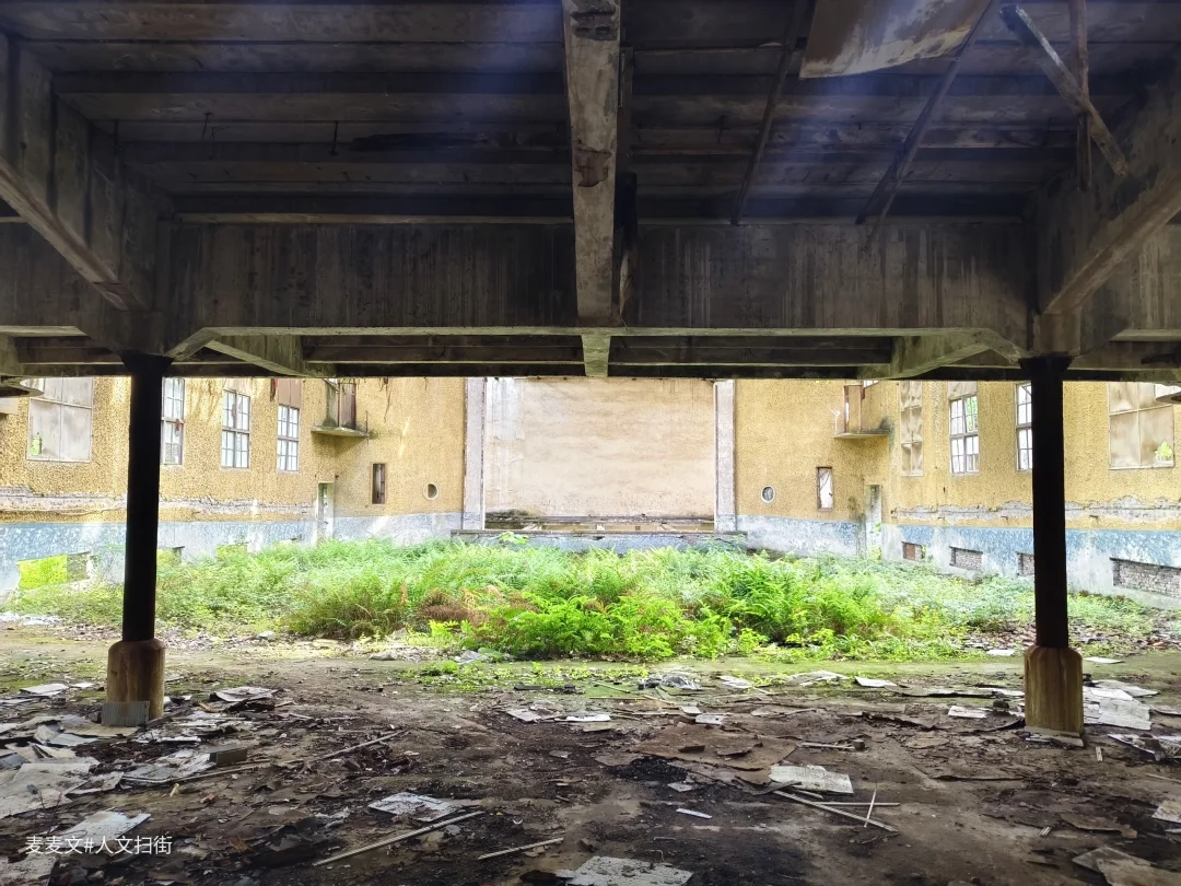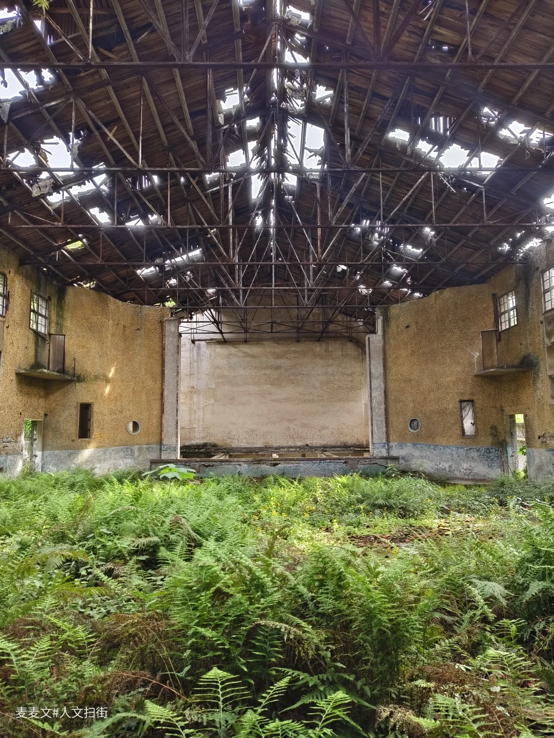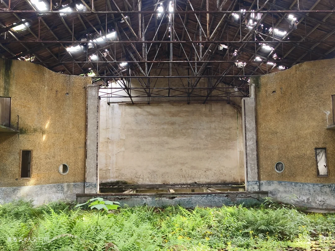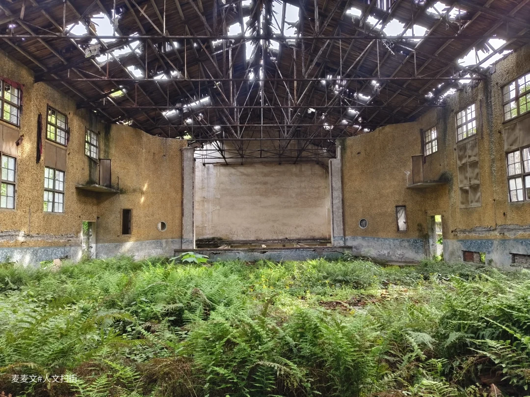 红光厂电影院沉睡在四川省华蓥市禄市镇的角落,像一位被遗忘的贵族。这座建于上世纪七十年代的老电影院,见证了国营红光仪器厂的辉煌,虽被时光侵蚀,骨架依然挺拔。推开发出呻吟的厚重木门,阳光从破碎的天窗斜射进来。观影区的座椅早已不见踪影,地面裂缝里钻出倔强的野草,在风中轻轻摇曳。主席台后墙爬满爬山虎,在斑驳的银幕前织成天然的幕布。偶尔有鸟雀从破窗飞入,在枝桠间跳跃鸣叫。傍晚时分,夕阳为整个建筑镀上金边,那些蓬勃生长的植物在殘垣断壁间舞动,仿佛在演绎一场永不落幕的生态戏剧。