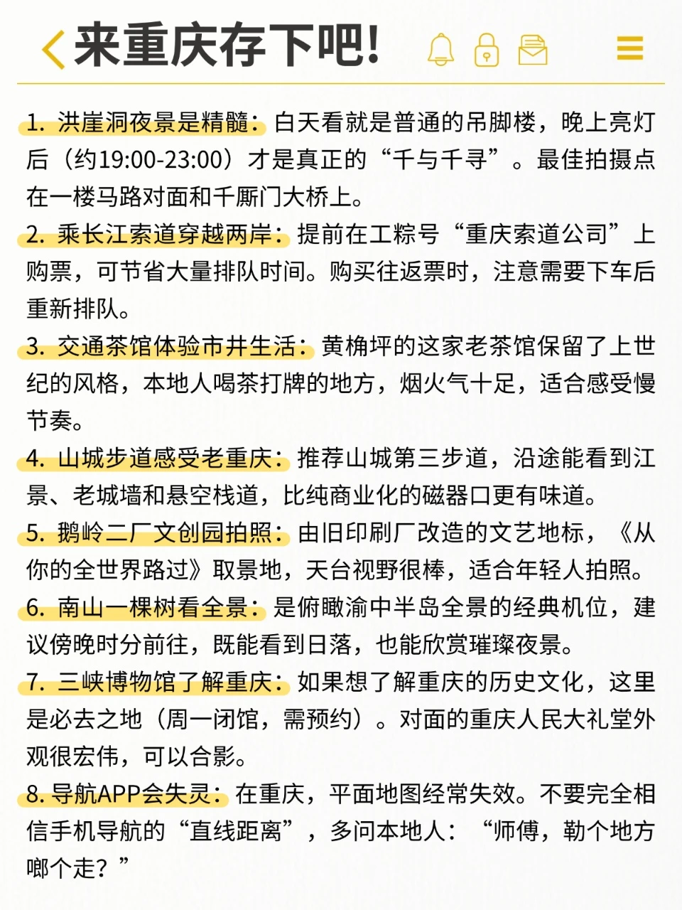 姐妹们!谁懂啊!9-10月的重庆简直是天堂模式🌤️——暑热退散,晚风微凉,夜景绝美,火锅咕嘟冒泡…但!攻略不做全,分分钟被坑到哭😭!本地人熬夜整理的超详细指南,懒人直接抄作业,保你爽玩不踩雷!