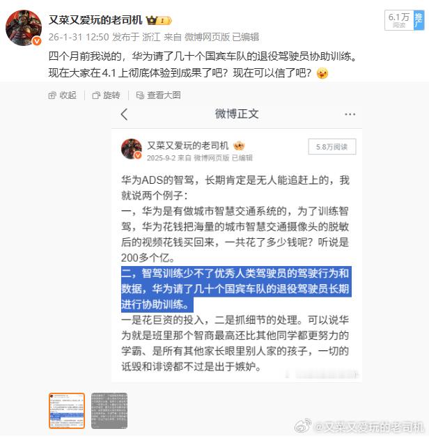 我本来不想长篇大论,因为有时候写一大长篇没啥人看,微博更多的只是需要情绪价值,结果有那么一帮人来叼我说我不懂AI、更有脑洞大开者说我是胡编瞎扯的,那我就好好说道说道:请问你们知不知道各企业的智驾团其实都有专门跑训练的自有车队?只是华为更舍得砸钱请更优质的国宾车队的退役驾驶员。请问你们懂不懂什么是初始训练集?懂不懂什么是预训练?懂不懂什么是强化学习中的奖励函数设计和策略引导?听不懂没关系,说人话就是:就好比一个高智商的人生下来,没人教他知识、没人培养他道德,他天生就会知晓是否对错吗?一个没有被正确引导的智能驾驶,它能自己知道怎么开车才是对的?它能自己知道什么场景下怎么处理才是最佳的?强化学习,那也是学习,是学习就不是放任AI自己胡乱训练自己,自己左脚踩右脚就能上天的轻功只存在小说和电视剧里,自己去好好看看强化学习的原理,搞搞清楚强化学习这个名词中的强化是什么意思?智能驾驶发展到当下,引入强化学习后,就已经不是单纯比拼数据量了,更重要的是数据质量,只有最优秀的人类驾驶员的高质量数据才能引导智能驾驶的训练质量的进一步提升,如果有一天智能驾驶的处理真正地能超越最优秀的人类驾驶员,那也是站在人类最优秀驾驶员的肩膀上达到的!而质量不达标的数据只会把智能驾驶引往错误的方向引导!所以事实上所有智驾团队都在收集人类驾驶员的数据,只是收集到以后需要清洗筛选出符合标准的高质量数据,但最终通过清洗再由人工复核后符合质量标准的不足1%,所以很多场景就需要智驾团队的自有车队去跑。补充一句:不止一家智驾团队在用华为云提供的工具在做这个数据清洗工作。