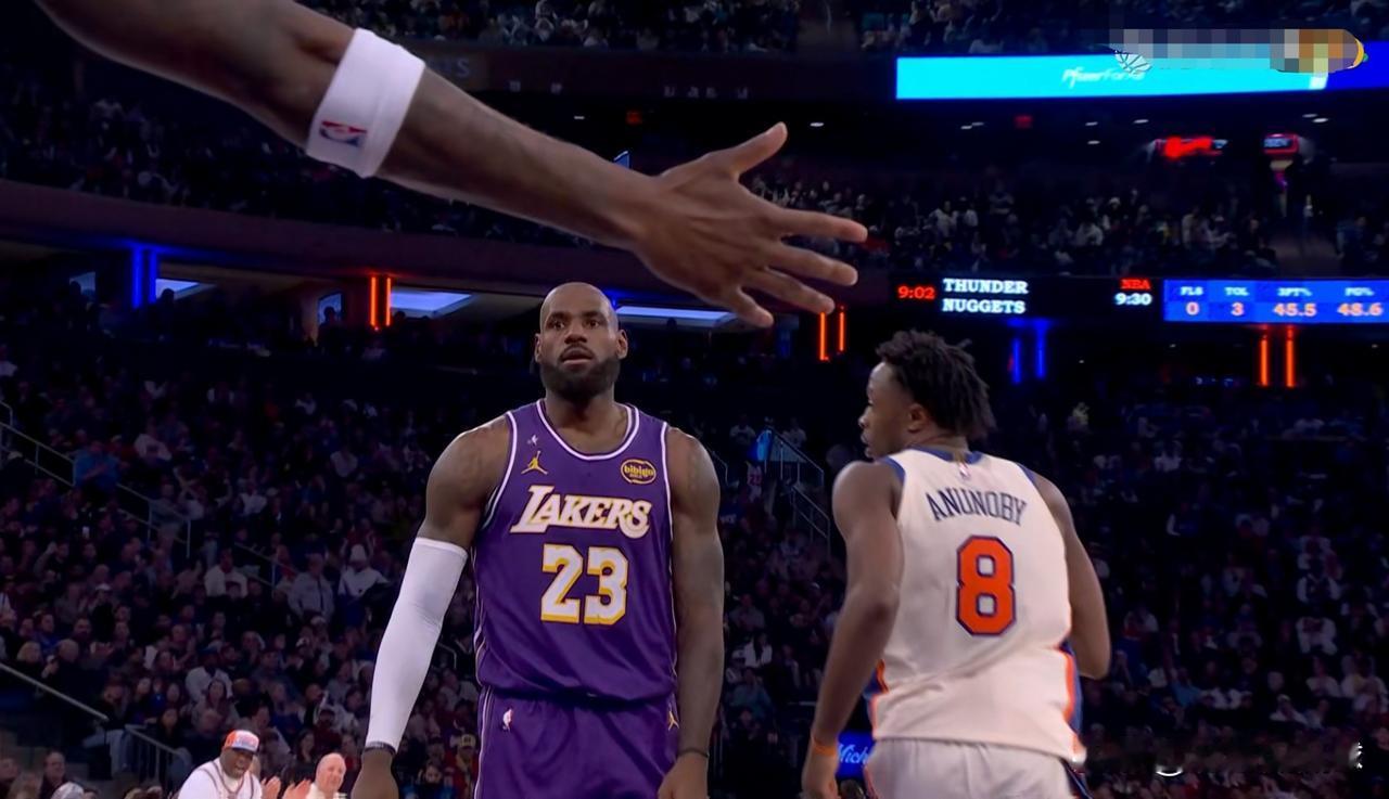 湖人超级巨星詹姆斯怒视范德比尔特!在今天湖人客场挑战尼克斯的比赛中,当时比赛进行到了第四节的九分多钟,尼克斯大将阿奴诺比在篮下接到队友唐斯的传球后面对空篮轻松暴扣得手,这下可把湖人巨星詹姆斯给气坏了,只见詹姆斯先是对着范德比尔特摊手,接着詹姆斯非常生气的怒视范德比尔特。有意思的是,面对詹姆斯的抱怨,范德比尔特却摊手表示自己非常的无辜。