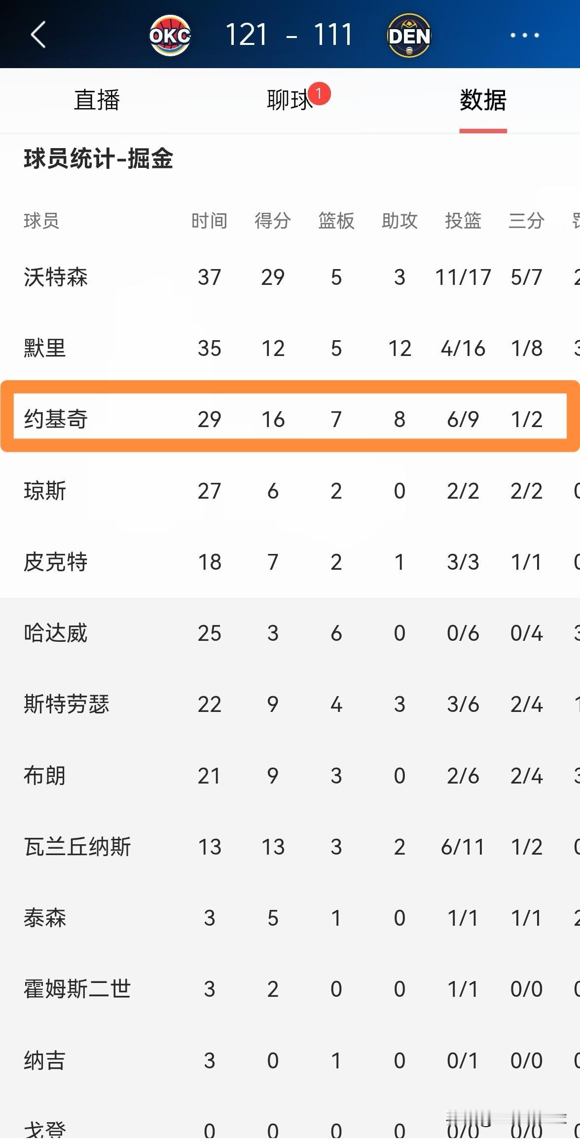 掘金当家球星约基奇再也不嚣张了!在今天掘金主场以111:121输给雷霆的焦点战中,约基奇首发出战29分钟,投篮9中6,其中三分球2中1、罚球4中3得到16分,却出现了全队最多的6次失误,他的场上正负值为-7。 值得一提的是,本场比赛约基奇遭到了雷霆巨星亚历山大的完爆,在第四节比赛的最后时刻,约基奇在替补席上完全的蔫巴了。