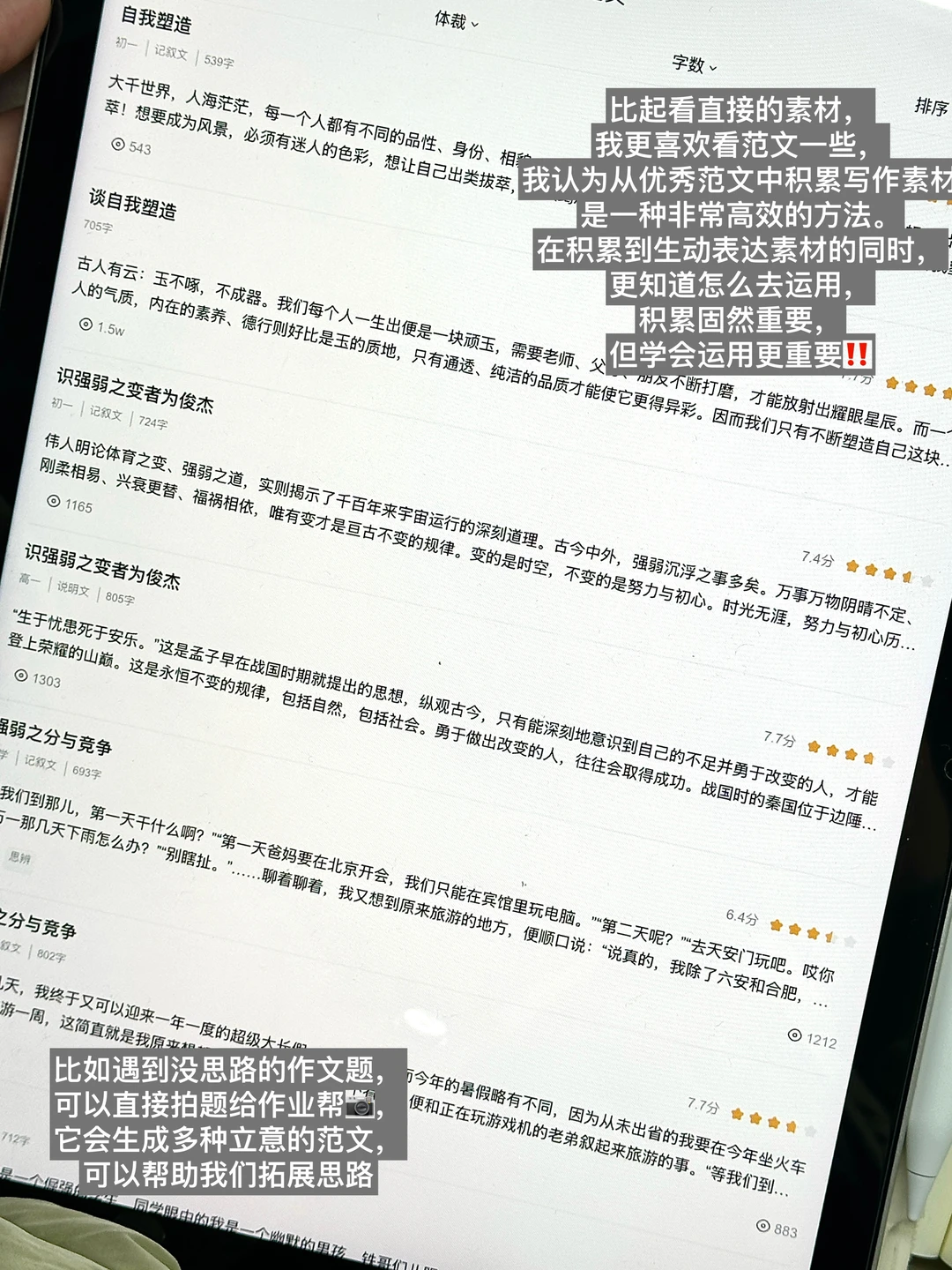 除了积累素材,写完作文后的复盘同样至关重要。现在,借助作业帮 app,我们可以轻松地将作文题目上传。app 会为我们推荐一系列优秀的范文,通过仔细观察这些范文的立意,我们可以拓宽自己的思维视野,了解到不同角度的思考方式,从而为自己的作文注入新的活力。而且,app 还会提供一些修改意见,我们可以根据这些建议,重新审视并修改自己的作文。在这个过程中,我们能够清晰地认识到自己作文的薄弱之处,比如是语言表达不够流畅、论据不够充分,还是逻辑结构不够清晰等。了解了这些薄弱点后,在下一次写作时,就可以有针对性地加以改进,着重注意那些曾经出错或不足的地方,逐步提升自己的写作水平。