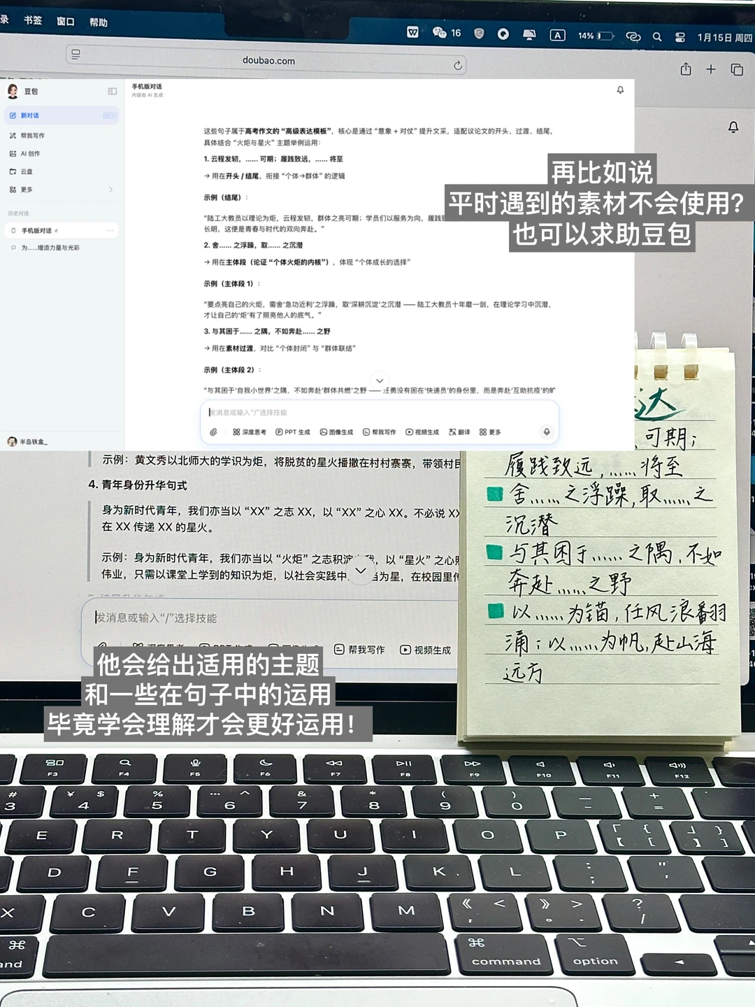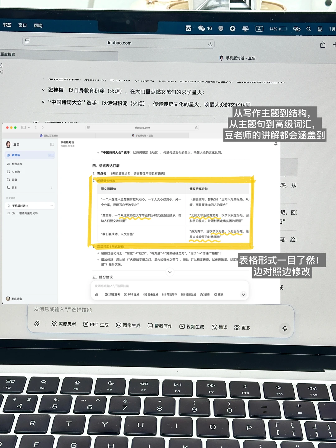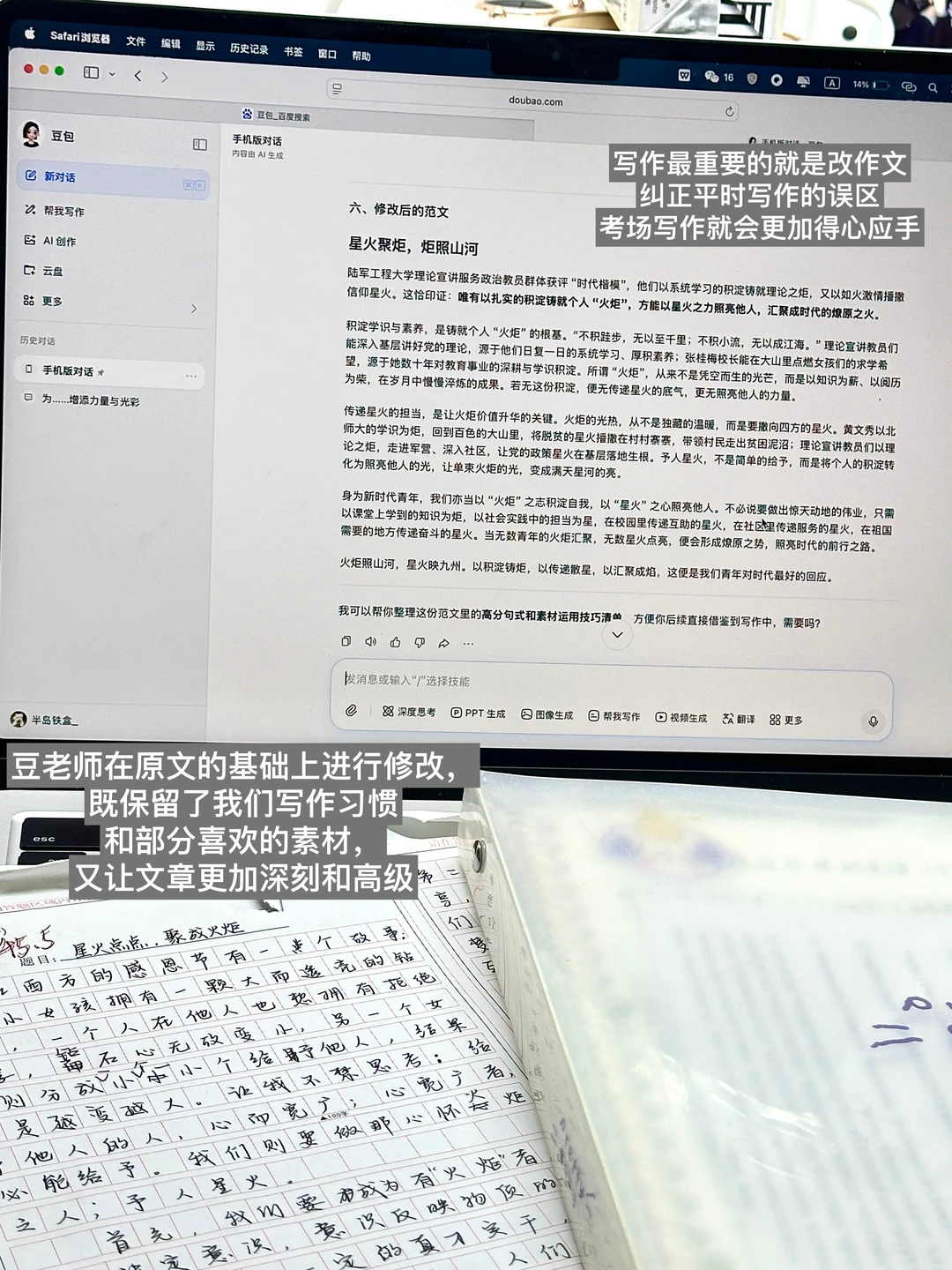 最戳我的是,豆老师不会直接推翻我的写作习惯,而是在原文基础上优化,保留我想用到的素材,改出来的作文既深刻又有我自己的风格。改完还会附上完整范文、高分句式清单,甚至连素材运用技巧都整理得明明白白📝
