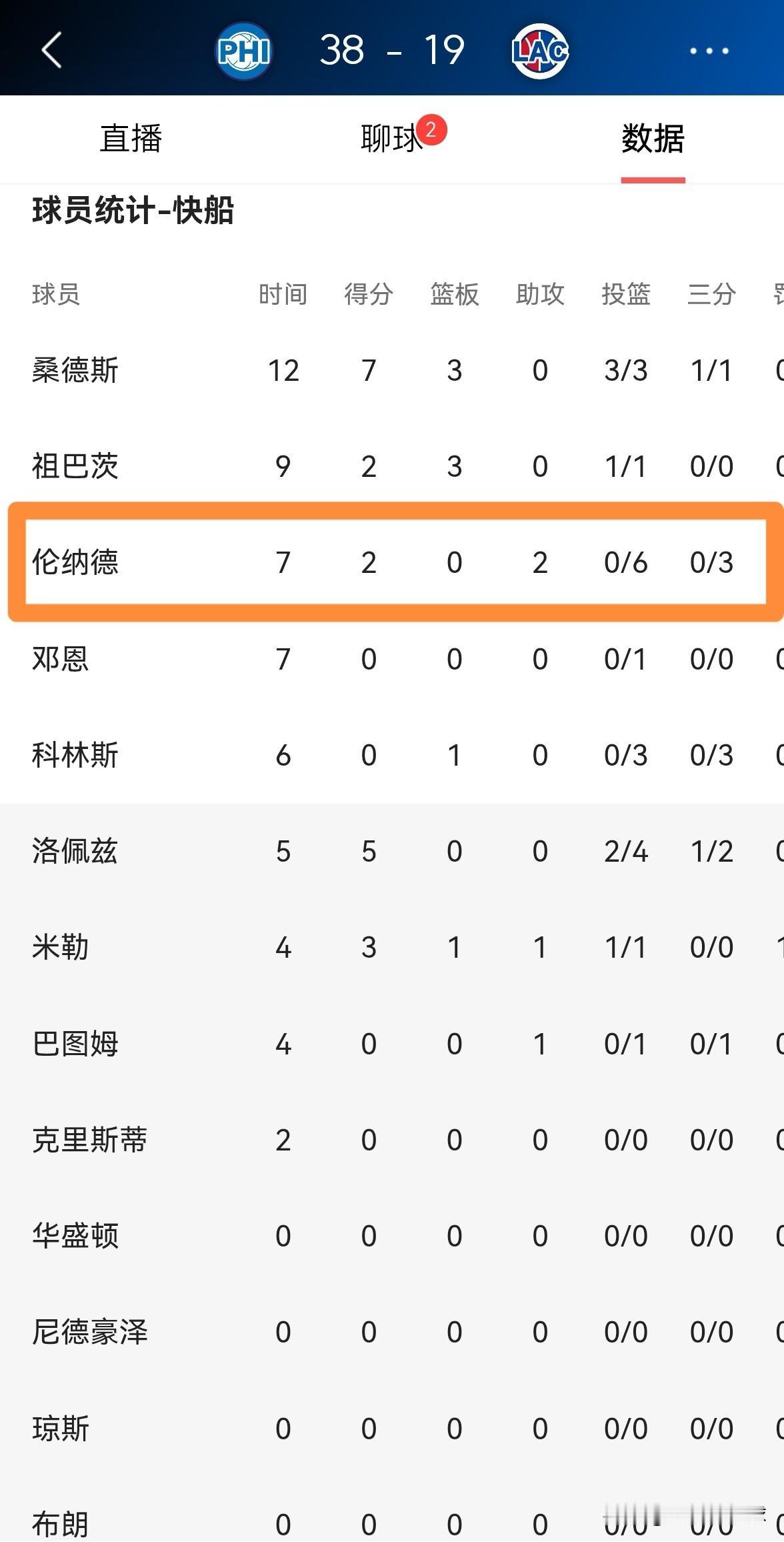 我强烈建议快船主帅泰伦-卢弃用伦纳德!在今天快船主场迎战76人的比赛中,目前双方的首节比赛已经结束,快船以19:38落后于。在第一节比赛中,伦纳德的状态极其的低迷,他在首发出战的7分钟里,投篮6中0,其中三分球3中0、罚球2中2仅仅得到可怜的2分,他的场上正负值为-15。 毫不客气的说,正是由于伦纳德的低迷,快船才在第一节比赛中挖了一个大坑。以伦纳德目前的糟糕状态来看,卢教练应该在剩下的三节比赛中果断弃用伦纳德。