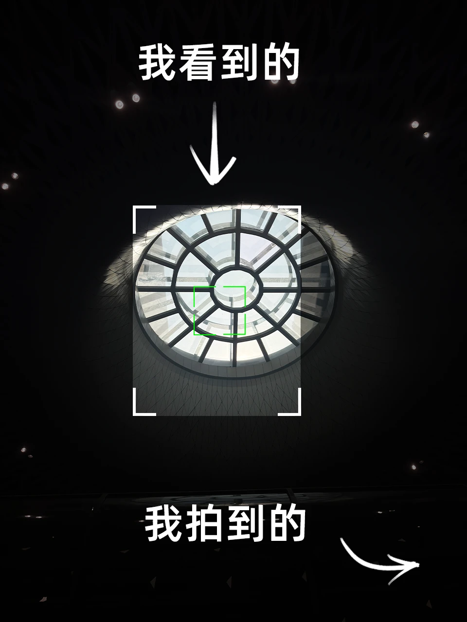 P4:中午的阳光穿过建筑结构,形成四周偏暗、中心区域明亮的光影关系。我用手机仰拍,并适当降低曝光,避免画面中亮部过曝。
