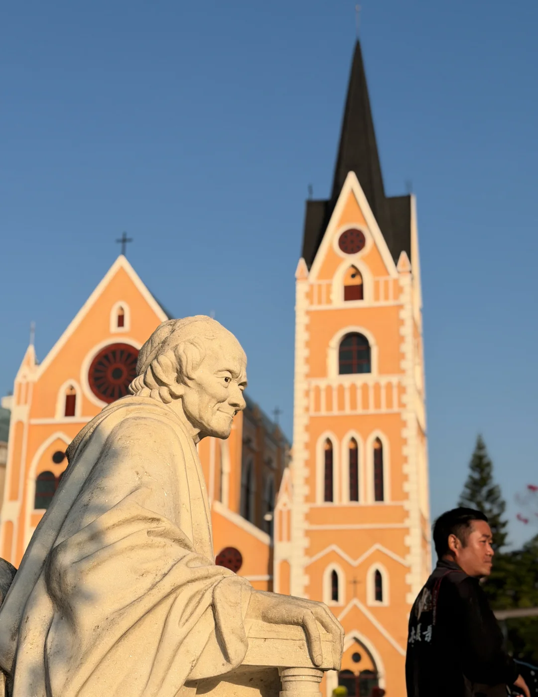 P18:在景区里看到建筑旁的雕塑在阳光照射下显得立体感十足,恰好一位男性走入画面,站在雕塑前方,人物的面部朝向与雕塑一致,于是果断按下快门,记录下这张具有相似性的画面。