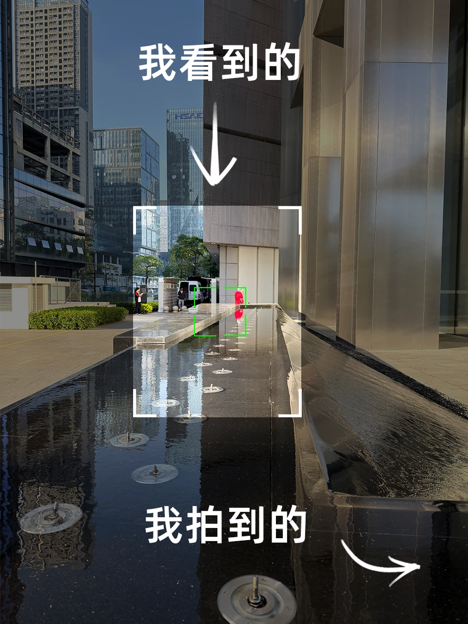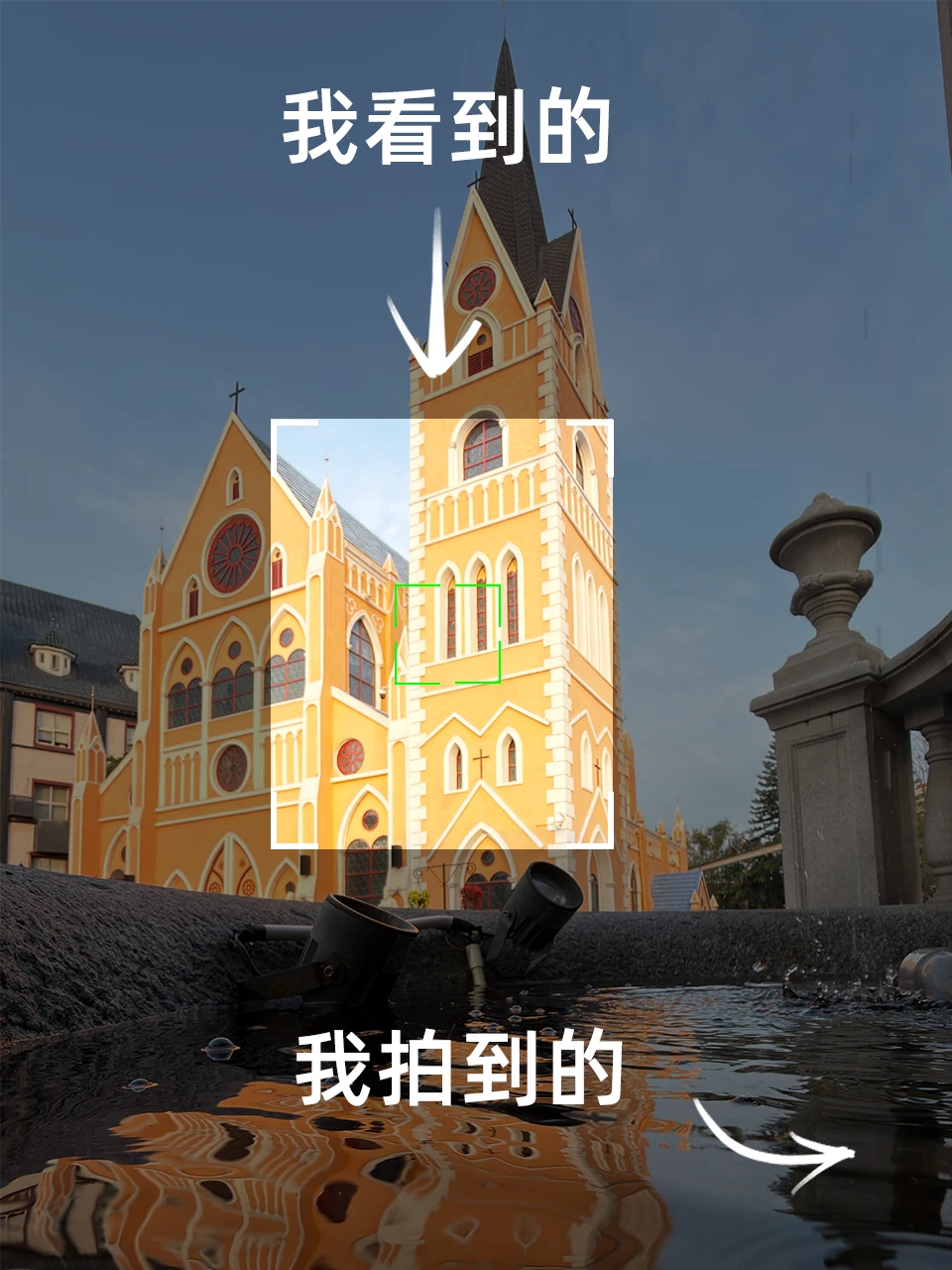 P6:在景区拍摄想要画面干净、简洁,可以借助水缸的倒影。拍摄时将手机镜头贴近水面,把建筑纳入画面,能拍出简洁又富有动感的建筑倒影。