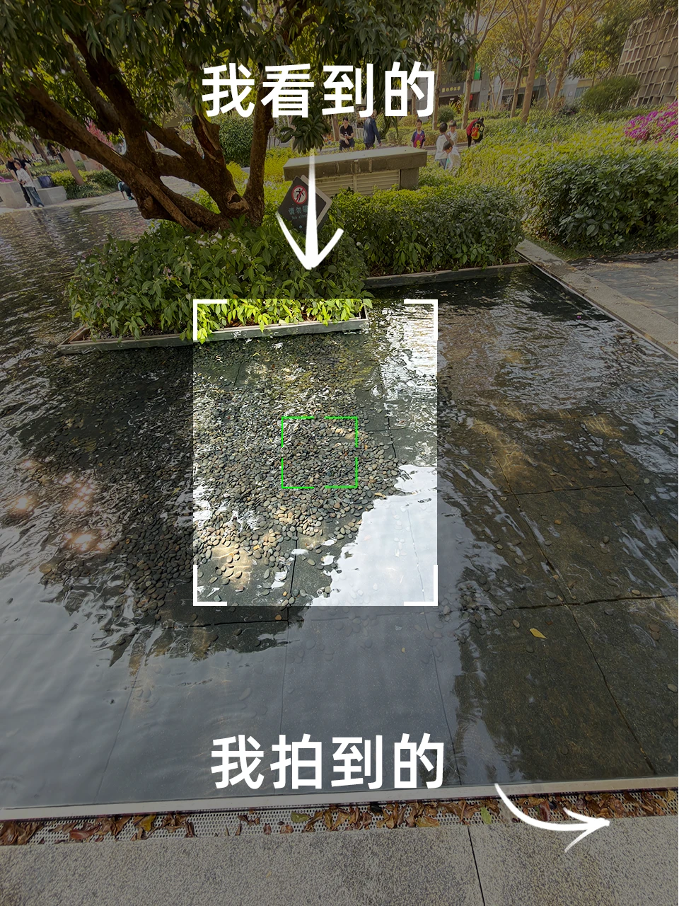 P2:利用电动车的后视镜作为画面框架,将远处的人物、树木和盛开的三角梅纳入其中,让原本杂乱的场景变得更加简洁、简洁。
