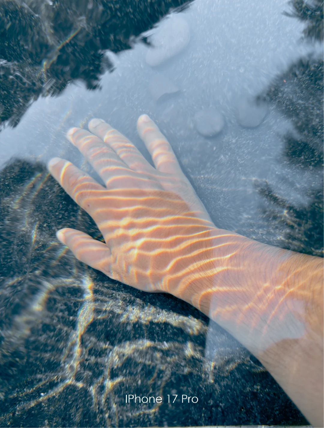 P8:选择光线折射明显的位置,将手伸入水池中,让光斑投射在手臂上。拍摄时需要拉低“小太阳”,保留画面亮部的细节信息。