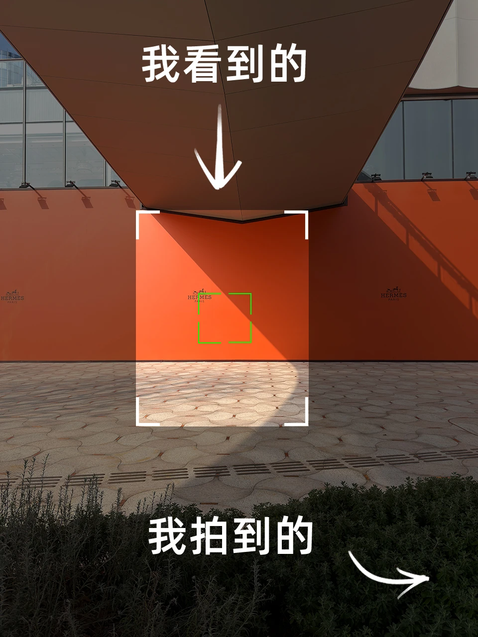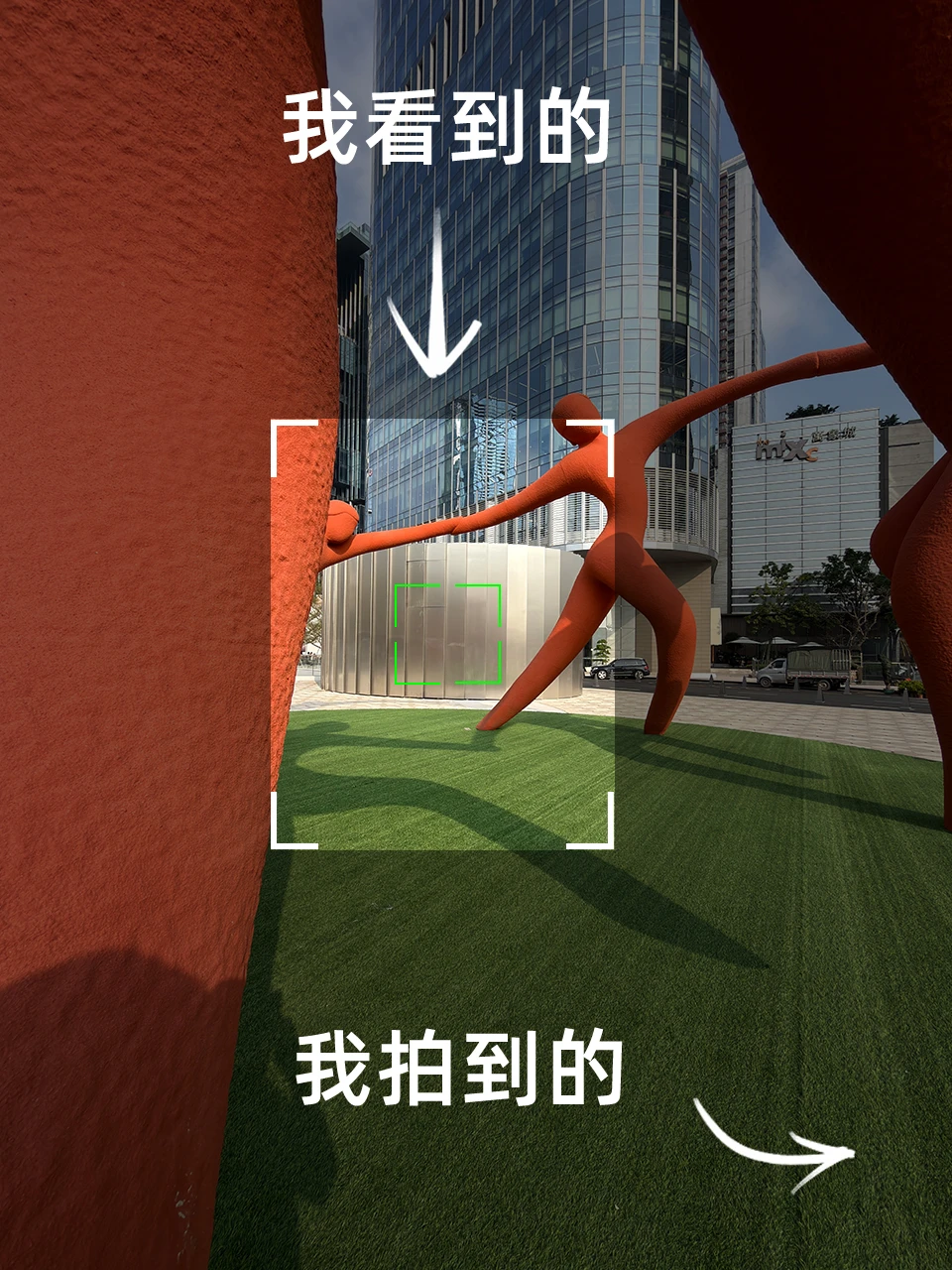 P14:看到建筑雕塑手拉手围成圆圈,阳光将它们的影子投射在绿色的人造草坪上,姿态充满动感。于是我模仿雕塑抬腿的投影,用手机自拍,拍下了一张具有呼应关系的照片。