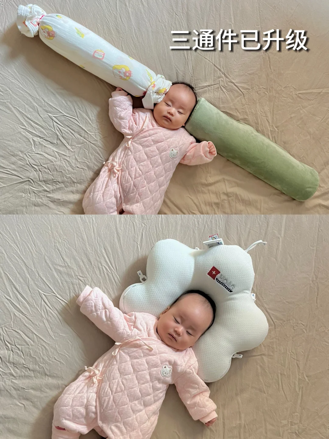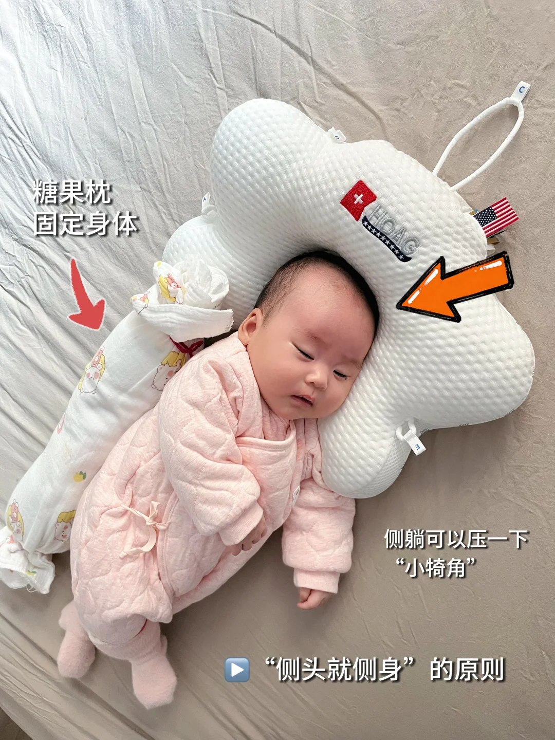 ✅ 用糖果枕挤在宝宝后背固定睡姿即可