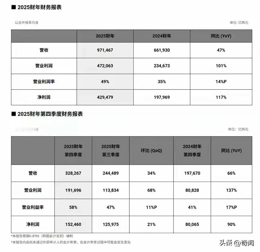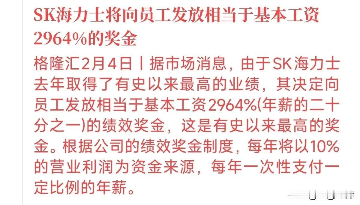 以讹传讹,网传韩国高科技企业SK海力士2025年年终奖是工资的2964%,全网都在称赞韩国企业福利太好了,什么时候国内企业能够跟上。通过权威媒体得知,确实韩国内存企业SK今年年终奖是基本工资的近30倍,但是请注意是“基本工资”。 SK海力士的员工的收入组成是:基本工资+津贴+PI绩效+PS利润分成,其中PS和PI都算是奖金,以年度来发放,工资和津贴以月度来发放。 以2025年为例,我们换算为人民币,海力士的平均基本工资是每月2.5万人民币;每月所有津贴合计平均1.6万人民币;PI绩效上下半年合计200%基本工资约为5万人民币;PS利润分成每个员工约67万元人民币。 也就是说海力士员工2025年平均收入达到122万元人民币,其中奖金就是67万,占总收入的55%,奖金是基本工资的近30倍。实际上奖金只是每月合计工资的15倍左右,不过也算是很高了。 sk海力士财报 SK海力士2025年奖金是工资的30倍