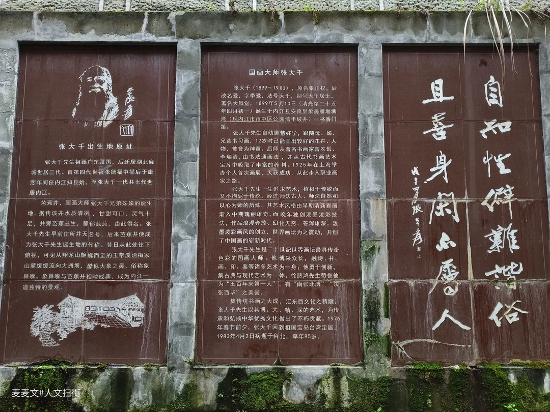 张大千出生于书香门第家庭,其故居原为四合院,后因城市变迁逐渐消失。2015年,内江市市中区人民政府在此设立“张大千出生地原址”地标,并建有芭蕉井展览馆、张大千博物馆及复原故居供游客参观。如今,芭蕉井已成为内江重要的文化符号,纪念这位“东方之笔”的艺术成就。