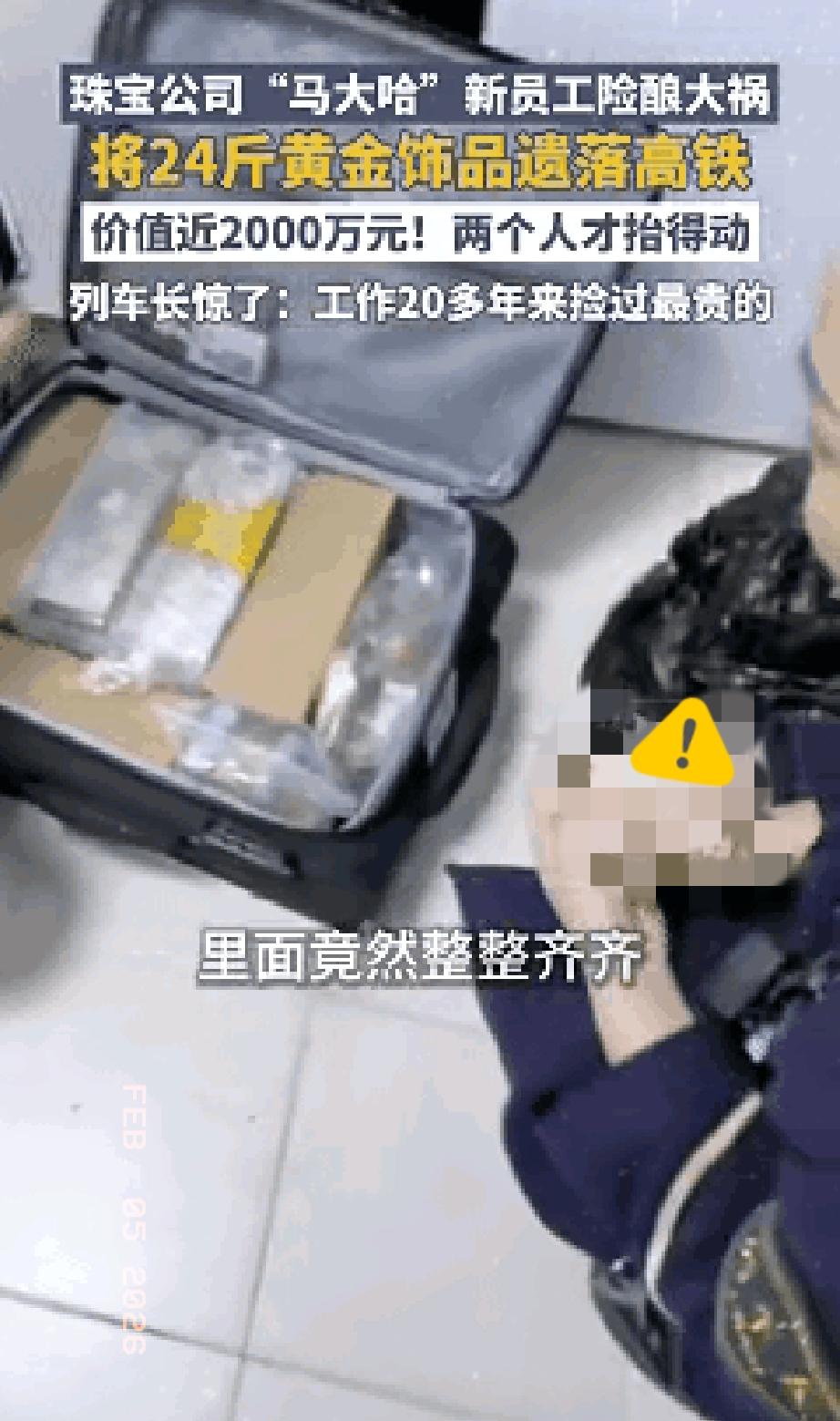 人怎么能闯这么大祸!近日上海,列车长检查高铁车厢时,在卧铺下方发现被遗留黑色行李箱,而且行李箱一个人根本提不动,没想到打开一看里面竟是摆放整齐的黄金饰品,足足有十二包,总共是十二公斤,加在一起价值接近两千万。 在那一刻,列车长吴佳雯的手臂骗不了人。这本该是一个再寻常不过的清晨收尾工作。1月26日早上7点04分,D914次列车把满载的疲惫与喧嚣卸在了上海站。 这哪里是不小心遗落,分明是珠宝公司把千万资产当儿戏!让毫无经验的新人独押运黄金,连双人复核都没有,这种管理漏洞比新人的粗心更可怕,说白了就是拿公司命运赌运气。 万幸列车长吴佳雯的专业和负责,不仅及时发现,更在规则和人情间找到最优解,视频核对面交、执法记录仪全程留痕,既守住了制度红线,又帮商家保住了布展机会,这才是真正的职业素养。 这事儿看着是捡回了黄金,实则是给所有企业敲了警钟:管理的底线永远比侥幸更重要,再值钱的资产,没有完善的制度兜底,早晚都会出问题。 而铁路工作人员的这份靠谱,也让我们看到,专业的人总能把意外变成安心。大家觉得企业该怎么完善贵重物资管理,才能避免这种离谱的失误?