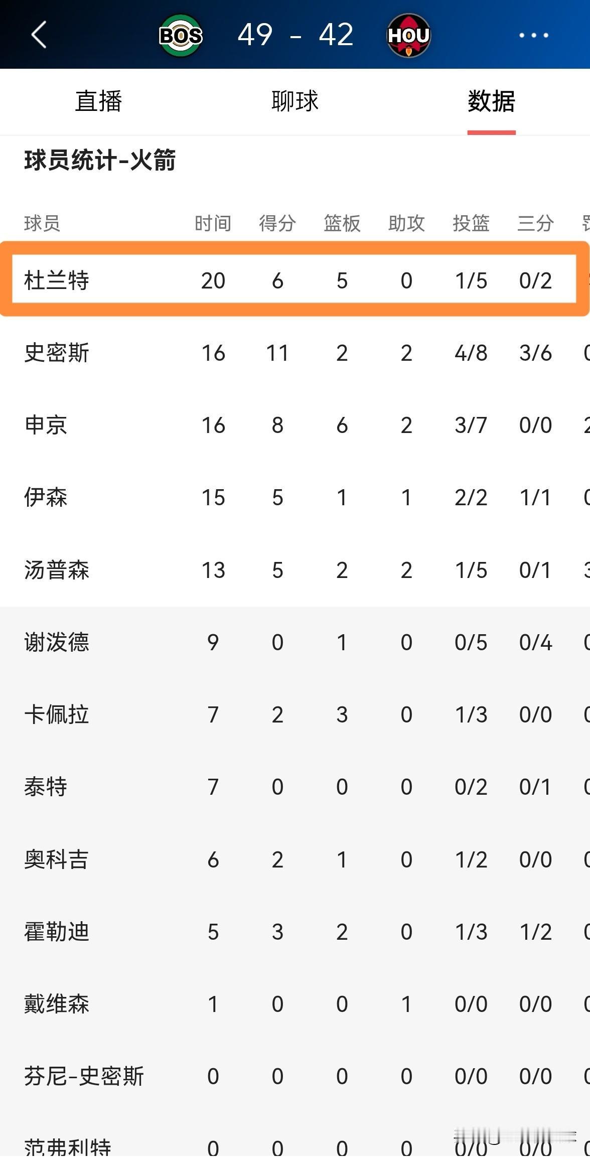 火箭超级巨星杜兰特真是状态堪忧!在今天火箭主场迎战凯尔特人的比赛中,目前双方半场战罢,火箭以42:49落后于对手。值得一提的是,在前两节比赛中,杜兰特在手感冰凉的情况下疯狂的抢到了5个篮板,杜兰特直接由一名超级得分手化身为了篮板痴汉。 在上半场比赛中,杜兰特首发出战20分钟,投篮5中1,其中三分球2中0、罚球4中4非常低效的得到6分,不过有5篮板1抢断1盖帽,他的场上正负值为-7。 希望杜兰特能够在下半场比赛中及时的调整好自己的状态,不然的话火箭必败无疑。