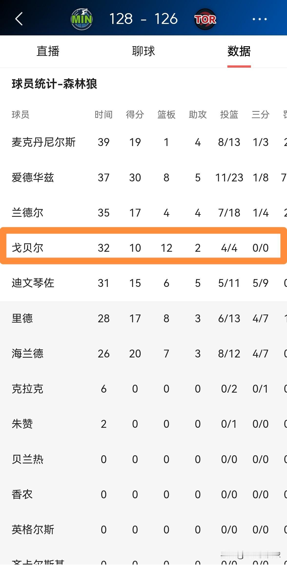 森林狼当家中锋戈贝尔真是毫无进攻欲望!在今天森林狼客场以128:126击败猛龙的比赛中,戈贝尔作为球队的首发中锋完全没有进攻欲望,全场比赛下来他仅仅出手了4次。 整场比赛下来,戈贝尔首发出战32分钟,投篮4中4,其中罚球5中2得到10分,外加12篮板2助攻1抢断1盖帽,他的场上正负值为全队最高的+11。