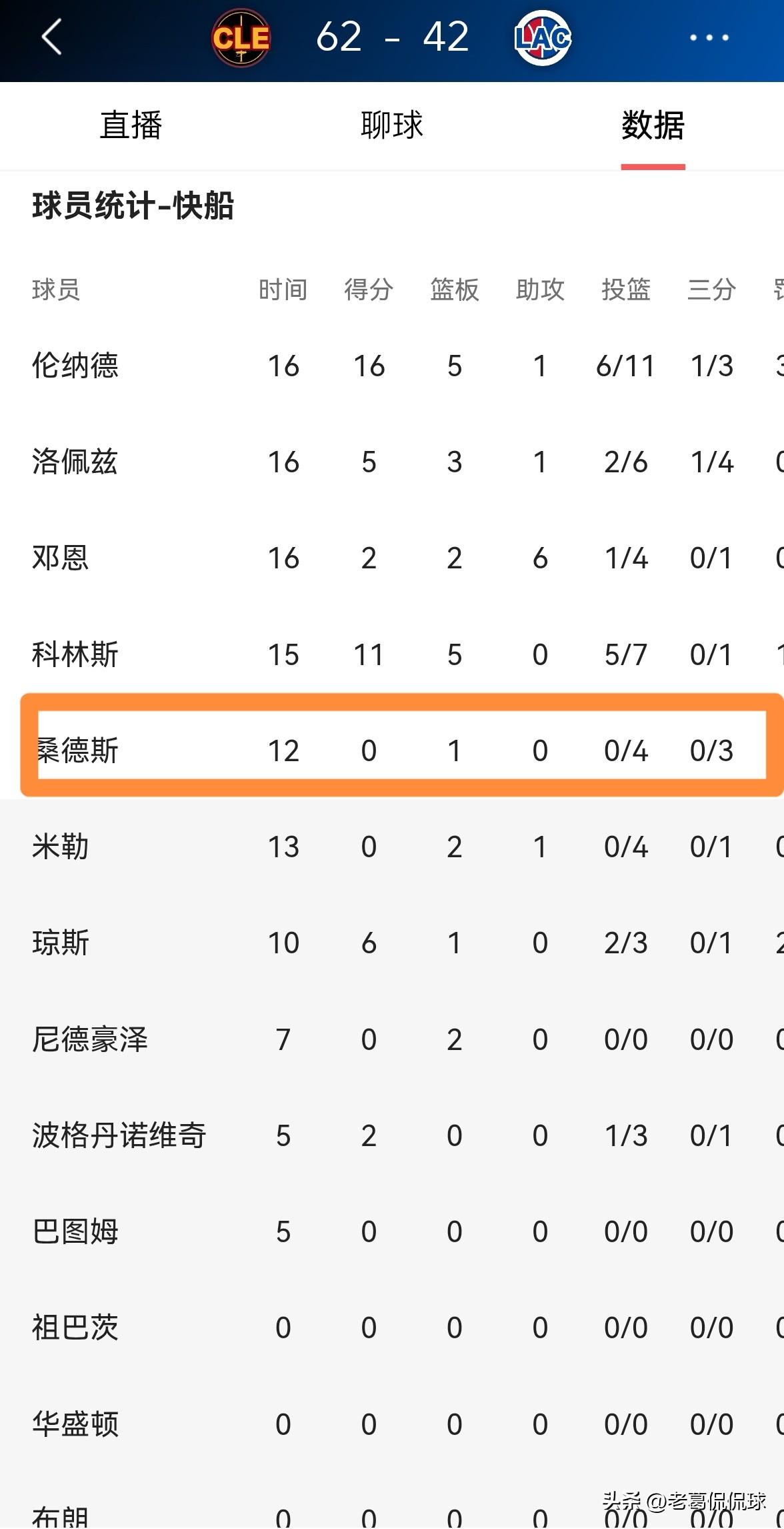 快船新秀桑德斯完全被打自闭了!在今天进行的快船和骑士的比赛中,目前两队的上半场比赛已经结束,快船以42:62落后于对手,形势看起来非常不乐观。在前两节比赛中,小将桑德斯在进攻端完全迷失了自我,他在首发出战的12分钟里,投篮4中0怒砍0分,还有1次失误和3次犯规,他的场上正负值为-6。 值得一提的是,在上半场比赛中,桑德斯在防守骑士当家球星米切尔时惨遭后者的完爆,桑德斯完全被米切尔打自闭了。