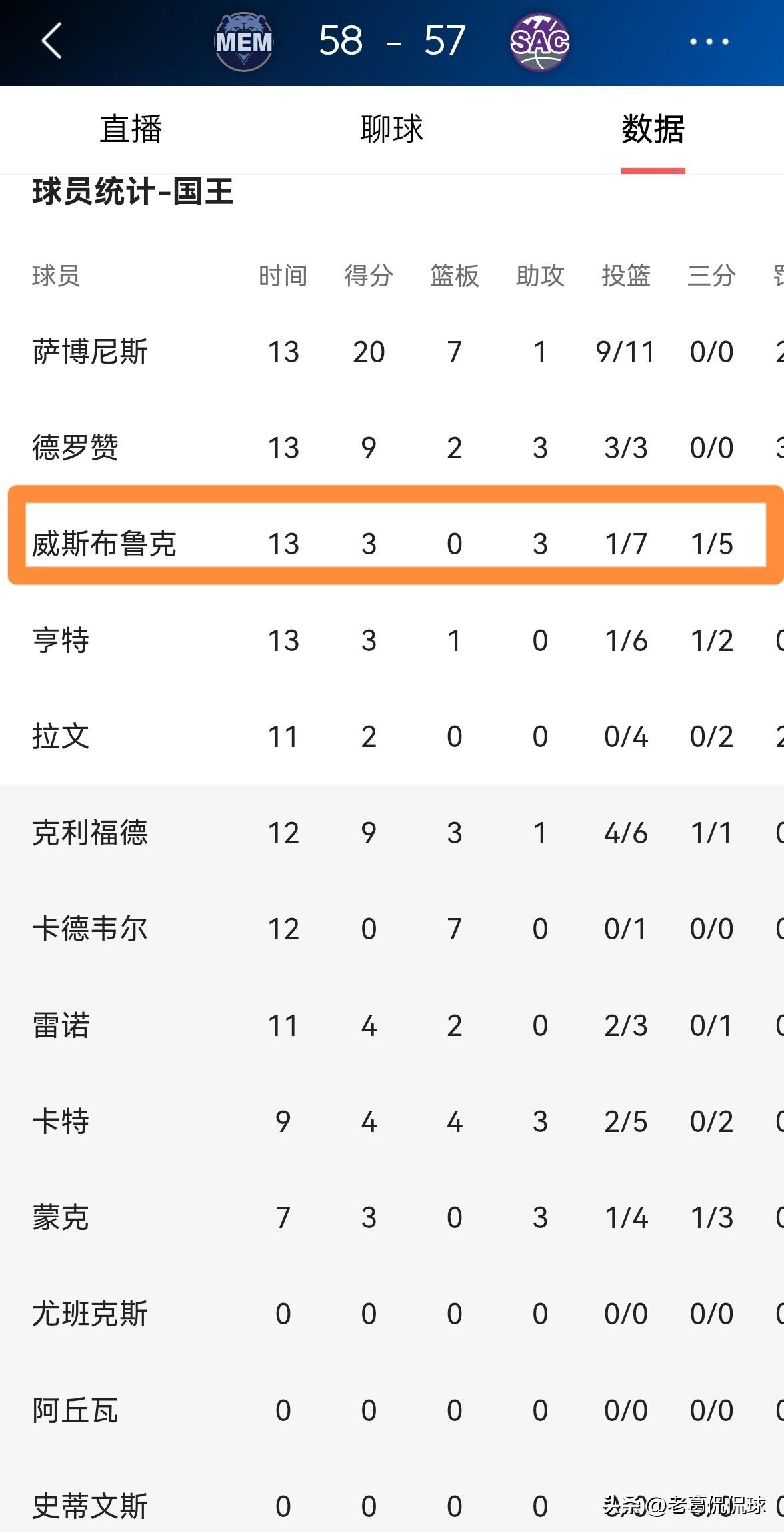 我强烈建议国王球星威斯布鲁克主动弃赛!在今天国王主场迎战灰熊的比赛中,目前双方半场战罢,国王以57:58落后于对手。在前两节比赛中,威斯布鲁克的投篮手感非常的冰凉,他在首发出战的13分钟里,投篮7中1,其中三分球5中1非常低效的得到3分,还出现了2次失误。 实事求是的说,以威少在上半场比赛中的糟糕表现来看,他简直就是球队的拖油瓶,如果威少能够在下半场比赛中主动弃赛,我相信国王赢球的概率会非常高。
