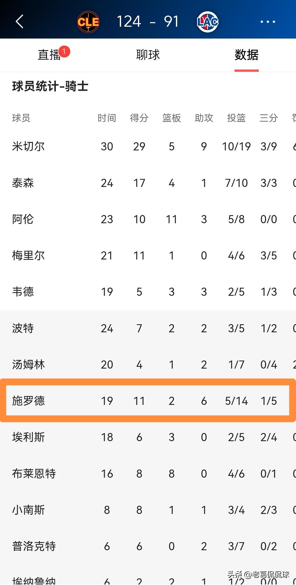 骑士新援施罗德真是球队的完美补充!在今天骑士客场以124:91大胜快船的比赛中,虽然施罗德的投篮手感不佳,但是他在其他方面为球队提供了非常大的帮助。 全场比赛下来,施罗德替补出战19分钟,投篮14中5,其中三分球5中1得到11分,还有2篮板6助攻3抢断,他的场上正负值为+15。 以目前的情况来看,在名人堂控卫哈登加盟骑士以后,施罗德完全可以胜任球队替补控卫的角色,施罗德的加入让骑士如虎添翼。