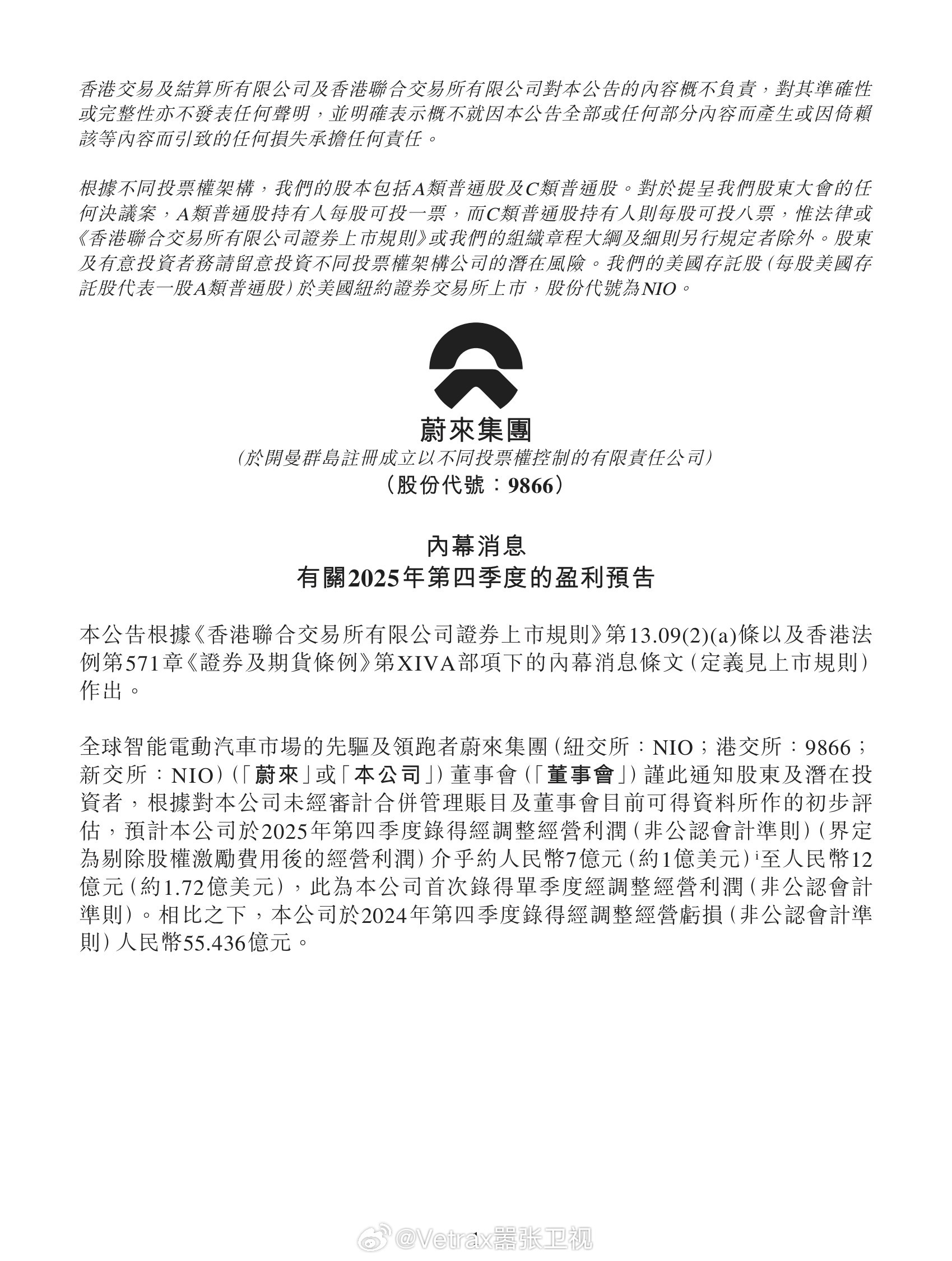 好不容易,蔚来终于盈利了……今日,蔚来发布盈利预告:公告称根据对本公司未经审计合并管理账目及董事会目前可得资料所作的初步评估,预计本公司于2025年第四季度录得经调整经营利润(非公认会计准则)(界定为剔除股权激励费用后的经营利润),介乎约人民币7亿元(约1亿美元)至12亿元(约1.72亿美元),此为本公司首次录得单季度经调整经营利润(非公认会计准则)。