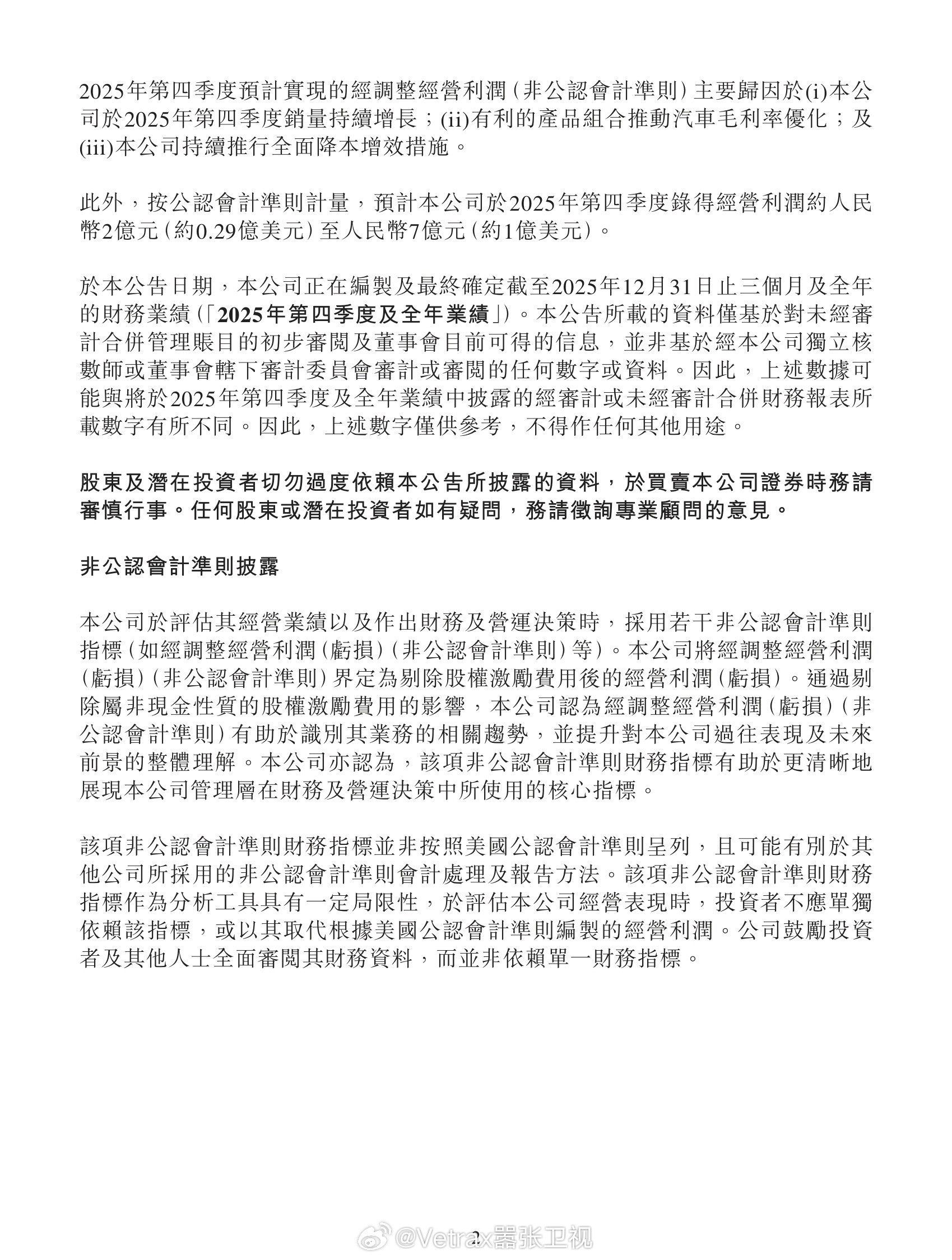 按公认会计准则,预计本公司于2025年第四季度录得经营利润约人民币2亿元(约0.29亿美元)至人民币7亿元(约1亿美元)。