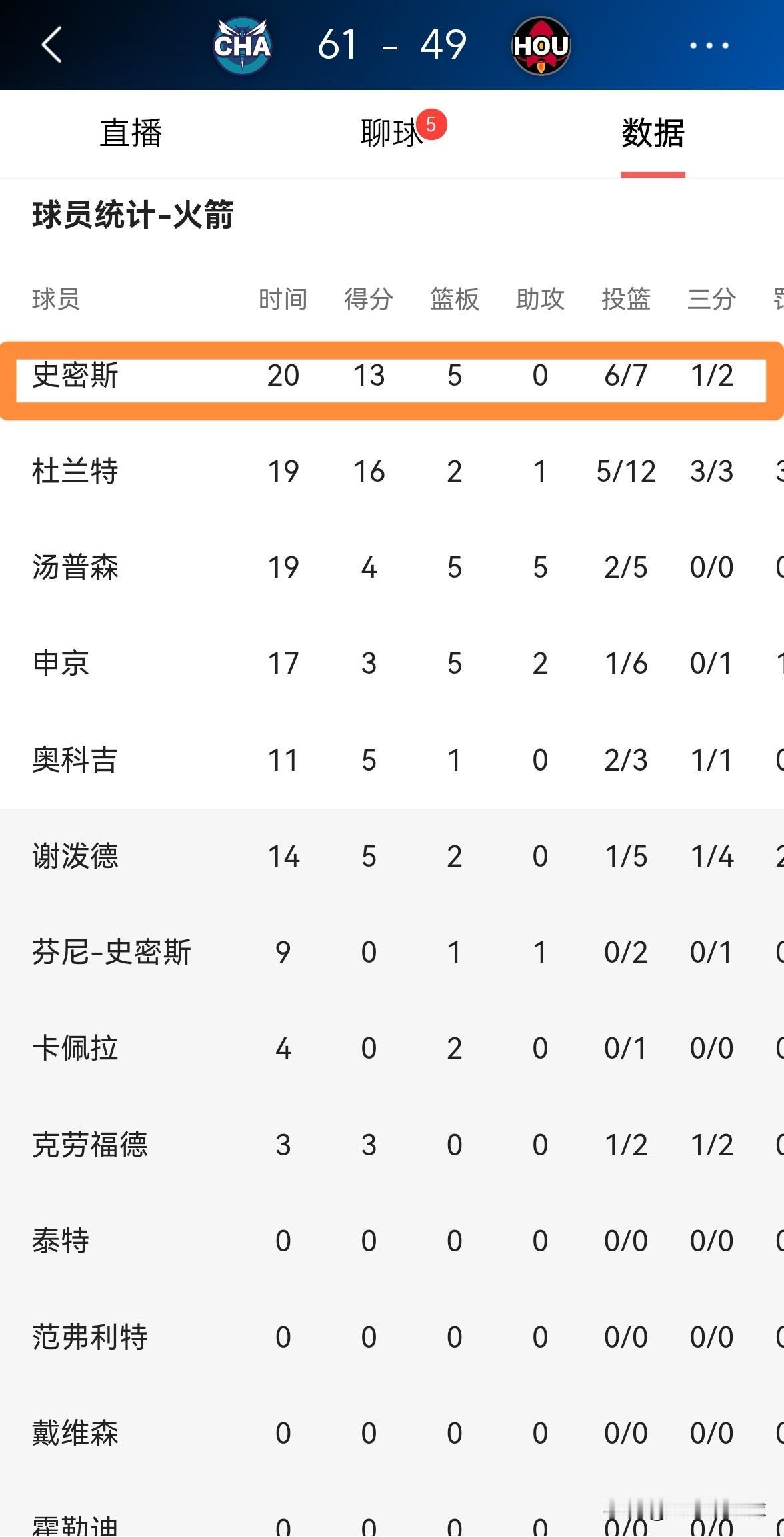火箭大将小史密斯真是弹无虚发!在今天进行的火箭和黄蜂的比赛中,目前双方的上半场比赛已经结束,虽然火箭以49:61落后对手12分,但是小史密斯在进攻端的表现堪称完美。 在前两节比赛中,小史密斯首发出战20分钟,投篮7中6,其中三分球2中1极其高效的砍下13分,还有5篮板2抢断1盖帽。 实事求是的说,小史密斯是火箭阵中在上半场比赛中表现最好的球员之一,小史密斯的表现甚至强于杜兰特。
