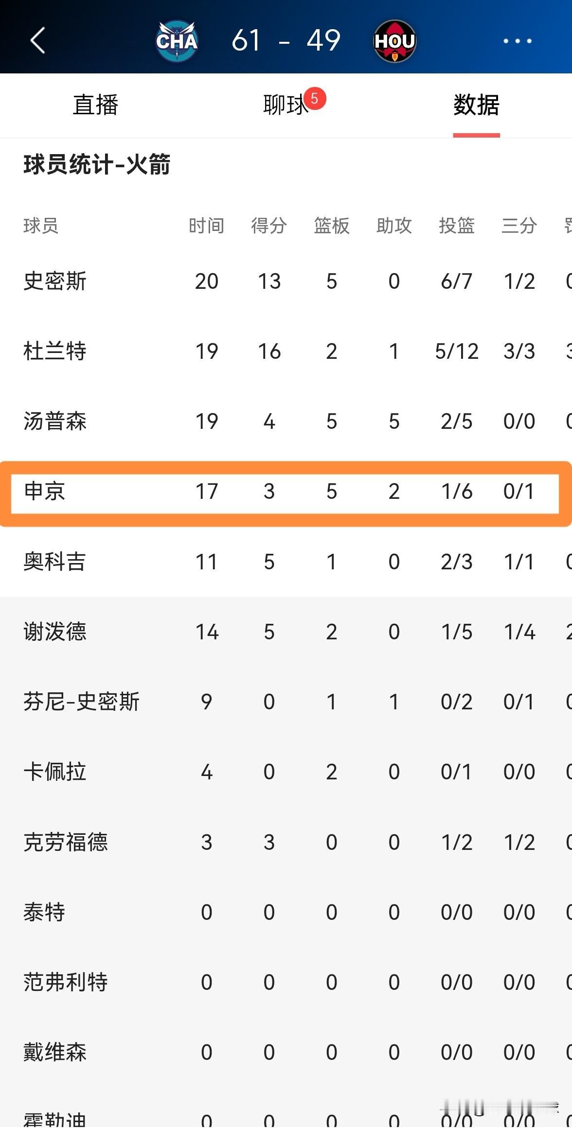 火箭巨星申京在拉胯方面果然没让人失望!在今天火箭主场迎战黄蜂的比赛中,目前两队的上半场比赛已经结束,火箭以49:61处于落后。在前两节比赛中,申京再次打出了拉胯的表现,他在首发出战的17分钟里,投篮6中1,其中三分球1中0、罚球2中1极其低效的得到3分,他的场上正负值为-6。 老实说,我对申京已经彻底的失去了信心,我对申京的拉胯早已经习以为常了。