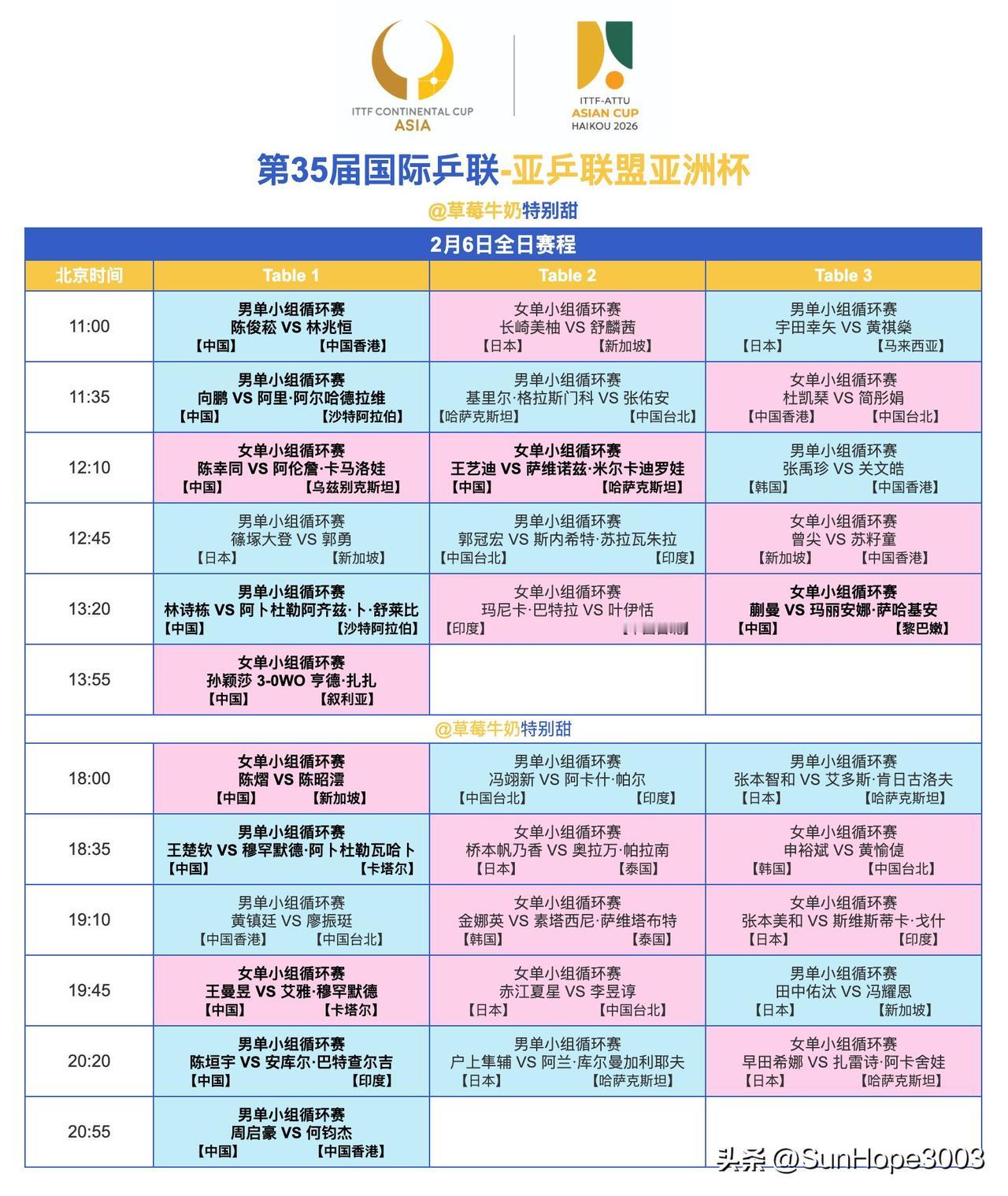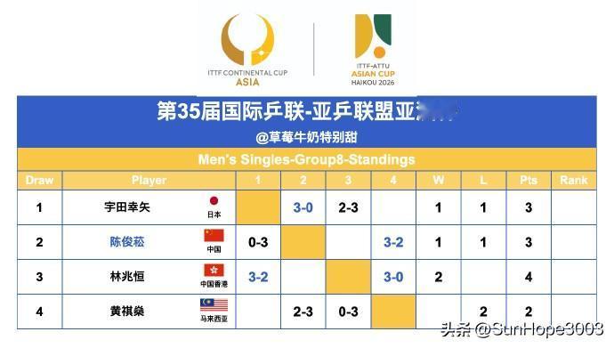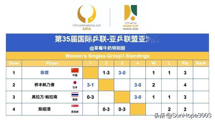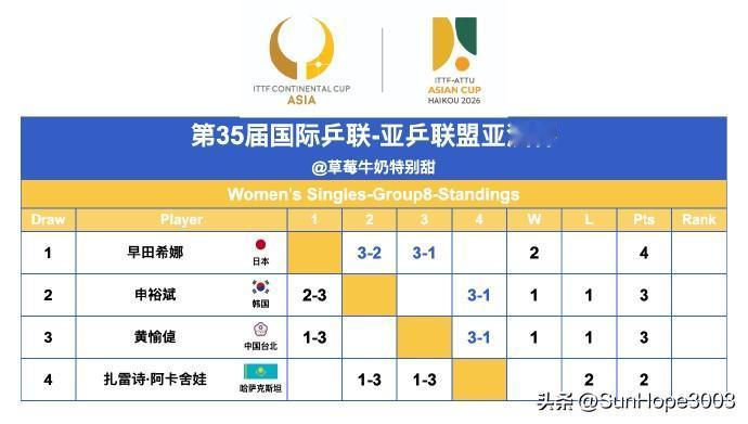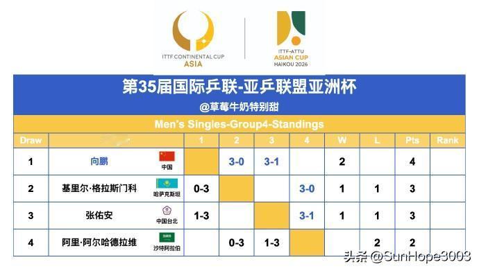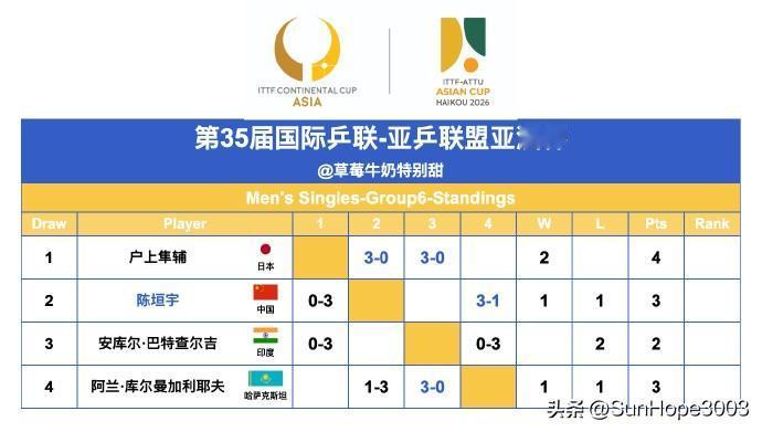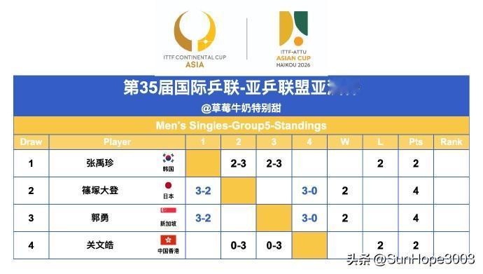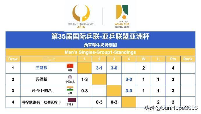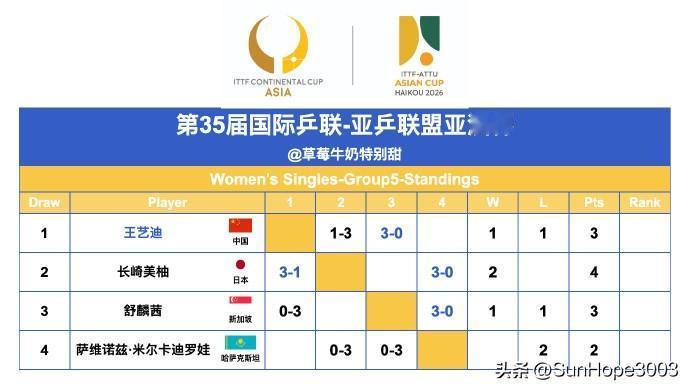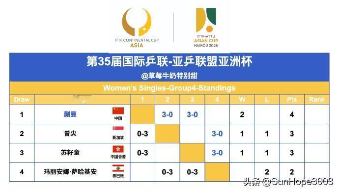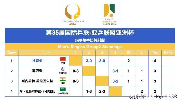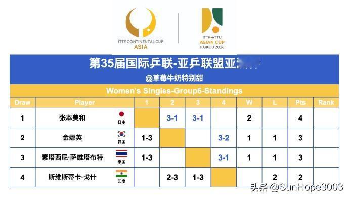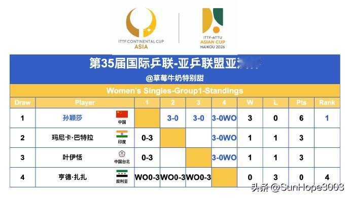 海口亚洲杯男女队小组赛积分情况和淘汰赛抽签仪式的时间。 孙颖莎已经率先小组出线,晋级到淘汰赛。 目前小组赛已经进行了两轮的比赛,今天是最后一轮,今天比赛结束,将会出现最终的积分,每个小组出线两名运动员。 以下是第二轮结束后的积分, 其中孙颖莎组因为亨德退赛,所以莎莎的比赛已经结束,锁定了小组第一出线, 另外一个名额,巴特拉和叶伊恬谁赢了谁出线。 男队这边张禹珍退赛。 淘汰赛的抽签仪式,将会在今天晚上比赛结束举行,预计是今晚的10点左右。