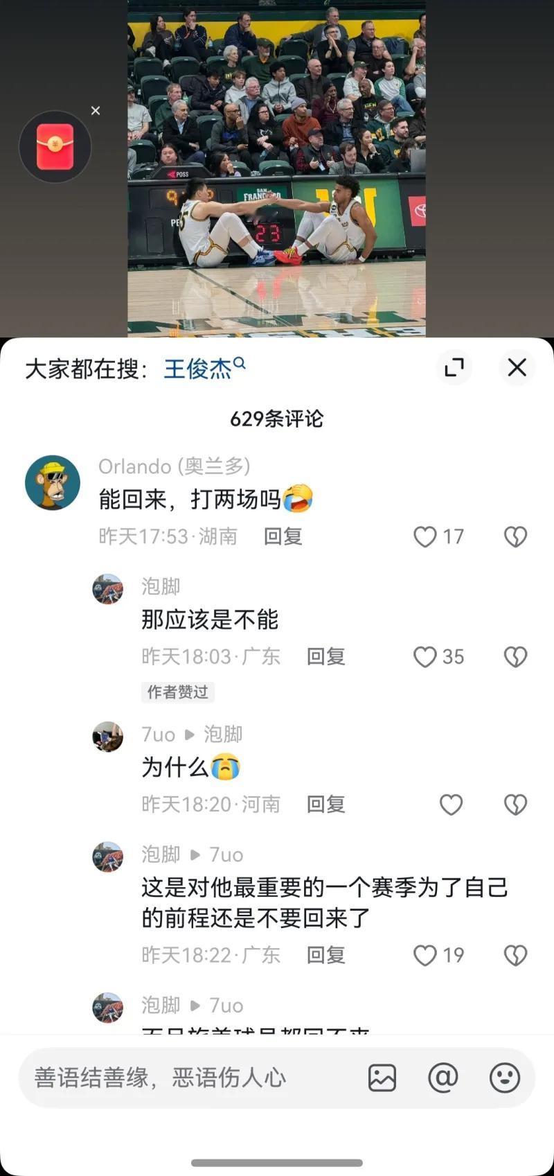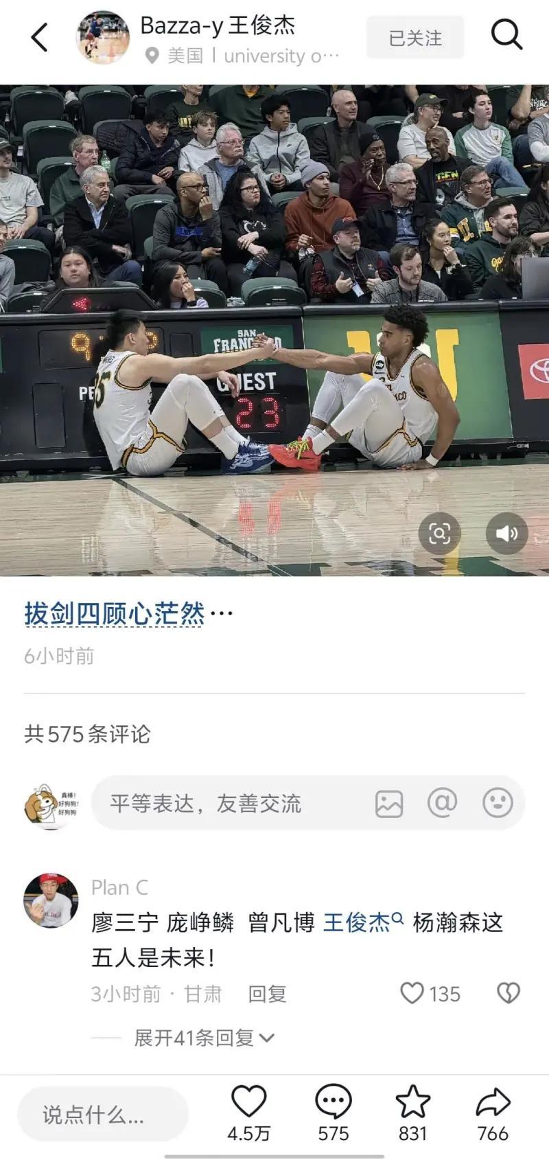 王俊杰对旧金山也失望了,估计要转校了。而且他还点赞为他解释不能回国打预选赛的评论,估计是对本赛季抱有很大期待的,结果不尽人意,下赛季大四打完也22岁了,估计要博一把
