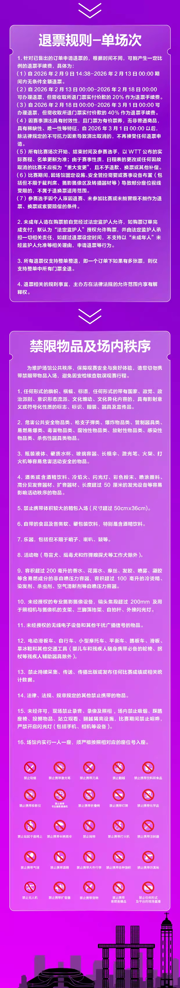 WTT冠军赛重庆站丨售票信息【全程通票VIP】10756元【单日通票VIP】10日-11日 1276元丨12日 1476元丨13日 1876元丨14日 2176元丨15日2676元【单场票价】68元-1488元不等【首次开票时间】2月9日14:38【售票平台】大麦