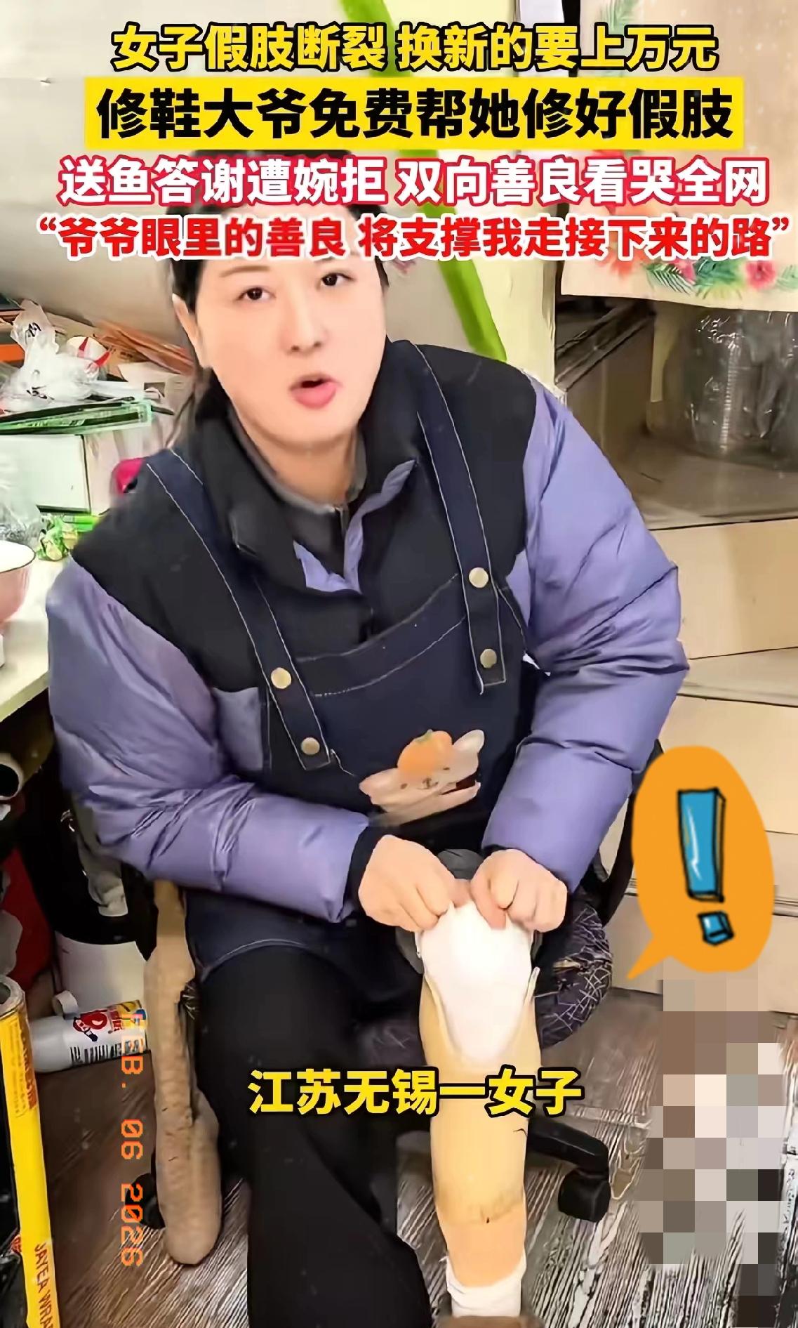 一大早看哭了!江苏无锡,女子假肢断裂,医生说换新的上万元,女子没钱,就拿着假肢问修鞋大爷能不能修?修鞋大爷修了一辈子的鞋子,从来没修过假肢,但他看到女子这么可怜,还是帮女子修好了!可是女子问大爷多少钱,大爷居然说…… “大爷……您能帮我修一下这个吗?医生说换新的要一万二,我实在拿不出……”一位拄着拐杖的年轻女子怯生生地走近,手里紧攥着一只断裂的假肢底座。 老人他修过上万双鞋,却从未碰过假肢。可当他抬头看见女子空荡的裤管、冻红的手指,和眼中强忍的泪水,那句“我没修过”到了嘴边,却变成了:“我试试吧。” 这声试试,藏着最朴素的温柔,不是什么惊天动地的善举,却是普通人对陌生人最真诚的托底。大爷拿着修鞋的工具,一点点涂胶、裁剪、打磨,把本不属于自己手艺范畴的假肢修得结实牢靠,这份用心,比昂贵的新假肢更暖人心。 当女子满心感激问起费用,大爷的一句不收钱,更是戳中了心底的柔软。他懂底层生活的难,知道一万二对女子来说是天大的负担,所以甘愿搭功夫搭材料,只想着帮一把。女子买鱼答谢被拒,这份双向的善意,让冰冷的现实多了滚烫的温度。 其实这世间的美好,从不是来自遥不可及的光芒,而是藏在街头巷尾的小美好里。修鞋大爷修的从来不是假肢,而是一个普通人对生活的希望,他用粗糙的手掌,粘合起了人与人之间最珍贵的善意,也让我们看到,平凡的人也能拥有最动人的光芒。这样的温暖瞬间,总能治愈生活的所有不易,你身边有没有这样暖心的普通人?