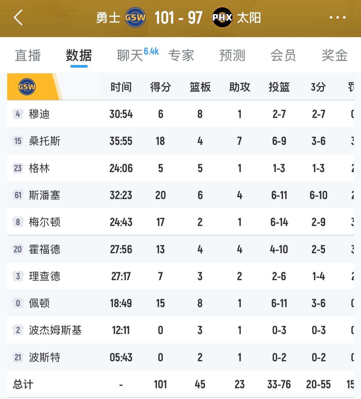 全民皆兵,勇士第四节收官阶段打了一波10比0逆转取胜太阳,斯潘塞、梅尔顿、霍福德、桑托斯、小佩顿、穆迪这帮人最后时刻打得真好啊。