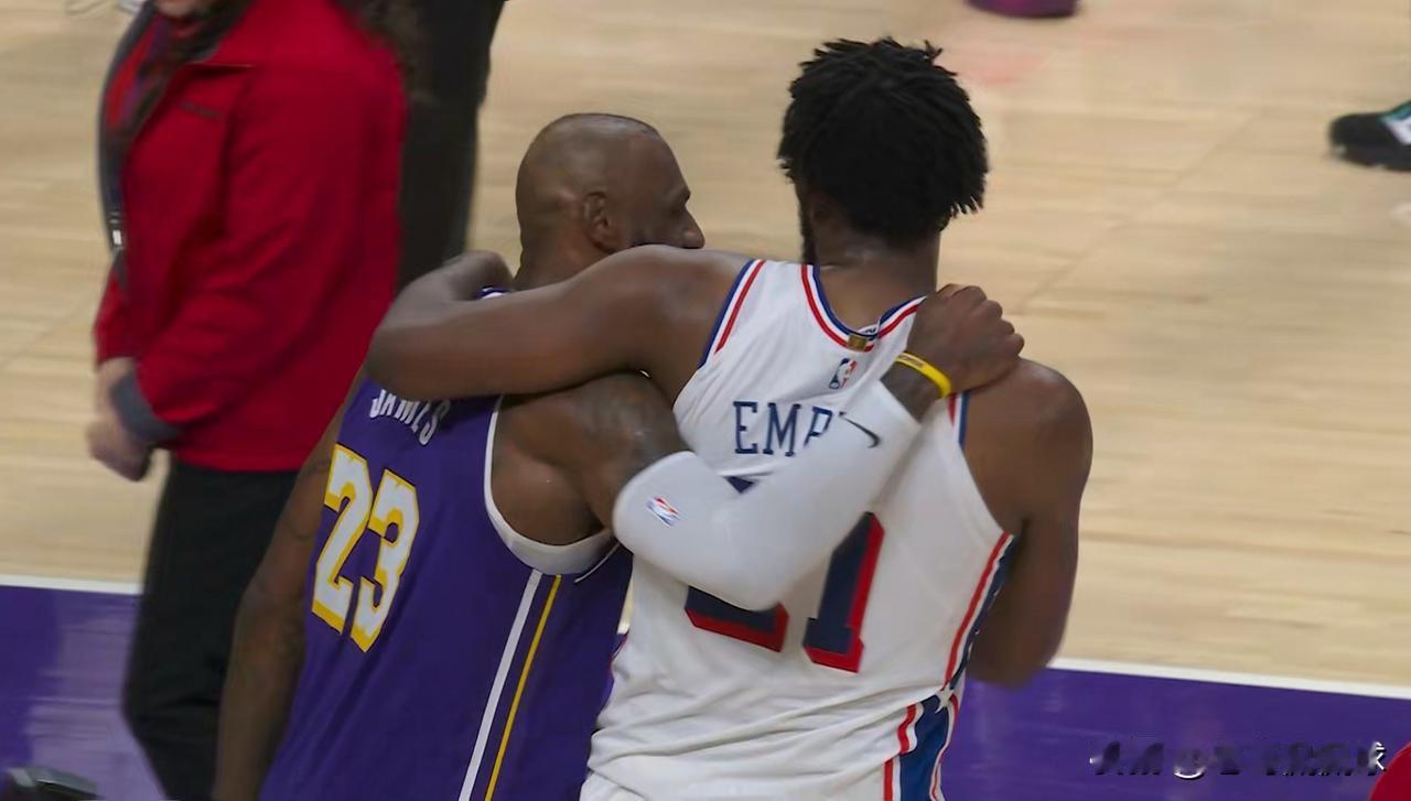 湖人超级巨星詹姆斯真是开心极了!在今天湖人主场以119:115险胜76人的赛后,当比赛的终场哨声响起以后,心情大好的詹姆斯第一时间走向了好兄弟恩比德,只见詹姆斯非常开心的和恩比德拥抱致意,在简单的寒暄之后,两个人更是勾肩搭背的有说有笑。 坦白说,从詹姆斯的面部表情来看,此时此刻詹姆斯的心情真是美极了。