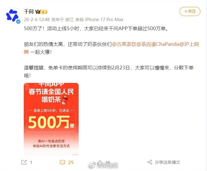 【#千问提醒网友分散下单#】2月6日,发博称奶茶活动上线5小时下单已超过500万单:“朋友们的热情太高,还带动了奶茶伙伴们一起火爆!温馨提醒,免单卡的使用期限可以持续到2月23日,大家可以慢慢来,分散下单哦! ” #微信再封元宝分享口令##千问回应带动奶茶店火爆#