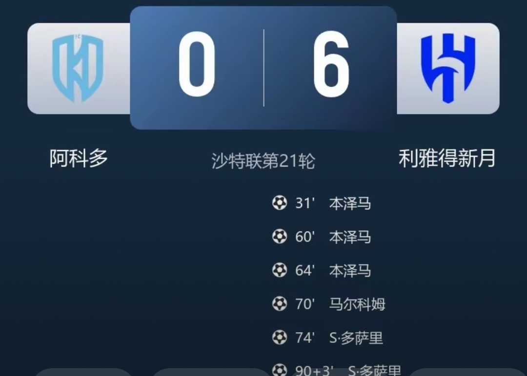 本泽马首秀戴帽!利雅得新月6-0横扫阿科多 新月3分领跑+终结连平本泽马曝本泽马与利雅得新月签约至2027年