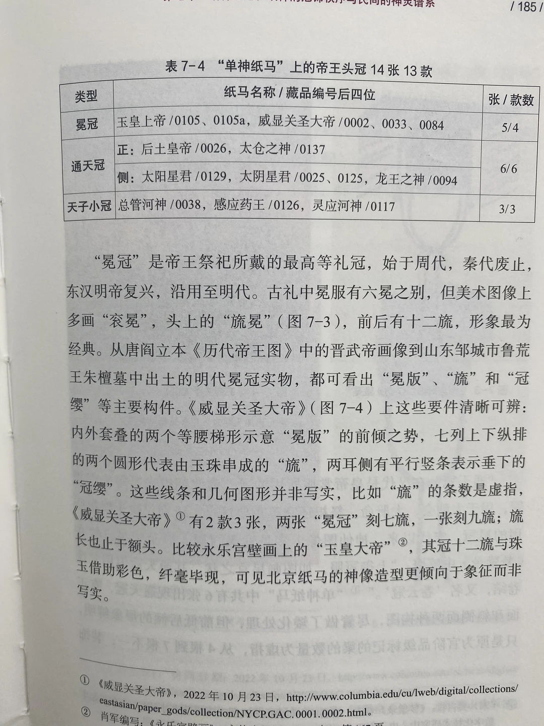 大众崇拜后,纸马还做到了“以图固史”、“以图传史的作用”,书中用药王解释了这一现象。还介绍了图像上的神王组合及形象差异——神冠,并以此补充民间与民俗视野下“官本位”观念下的冠服体系及影响