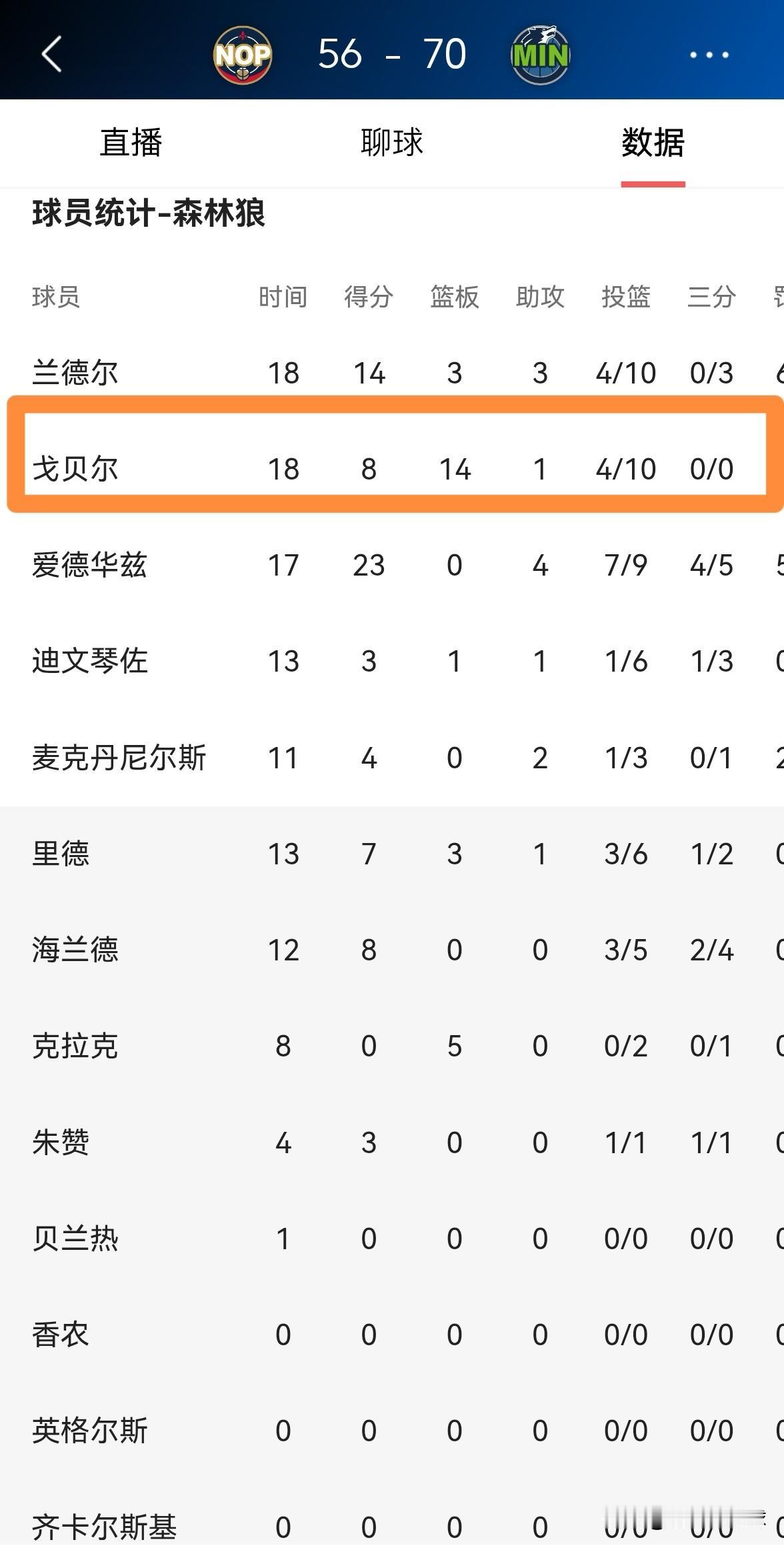 森林狼当家中锋戈贝尔真是太敢出手了!在今天进行的森林狼和鹈鹕的比赛中,目前双方的上半场比赛已经结束,森林狼以70:56领先对手。值得注意的是,在前两节比赛中,戈贝尔一反常态竟然出手了10次,他的出手数和兰德尔并列全队第一。 在上半场比赛中,戈贝尔首发出战18分钟,投篮10中4得到8分,外加14篮板1助攻2抢断1盖帽,他的场上正负值为全队最高的+15。 实事求是的说,能够在两节比赛中就出手10次,这对于戈贝尔来说真是太罕见了。