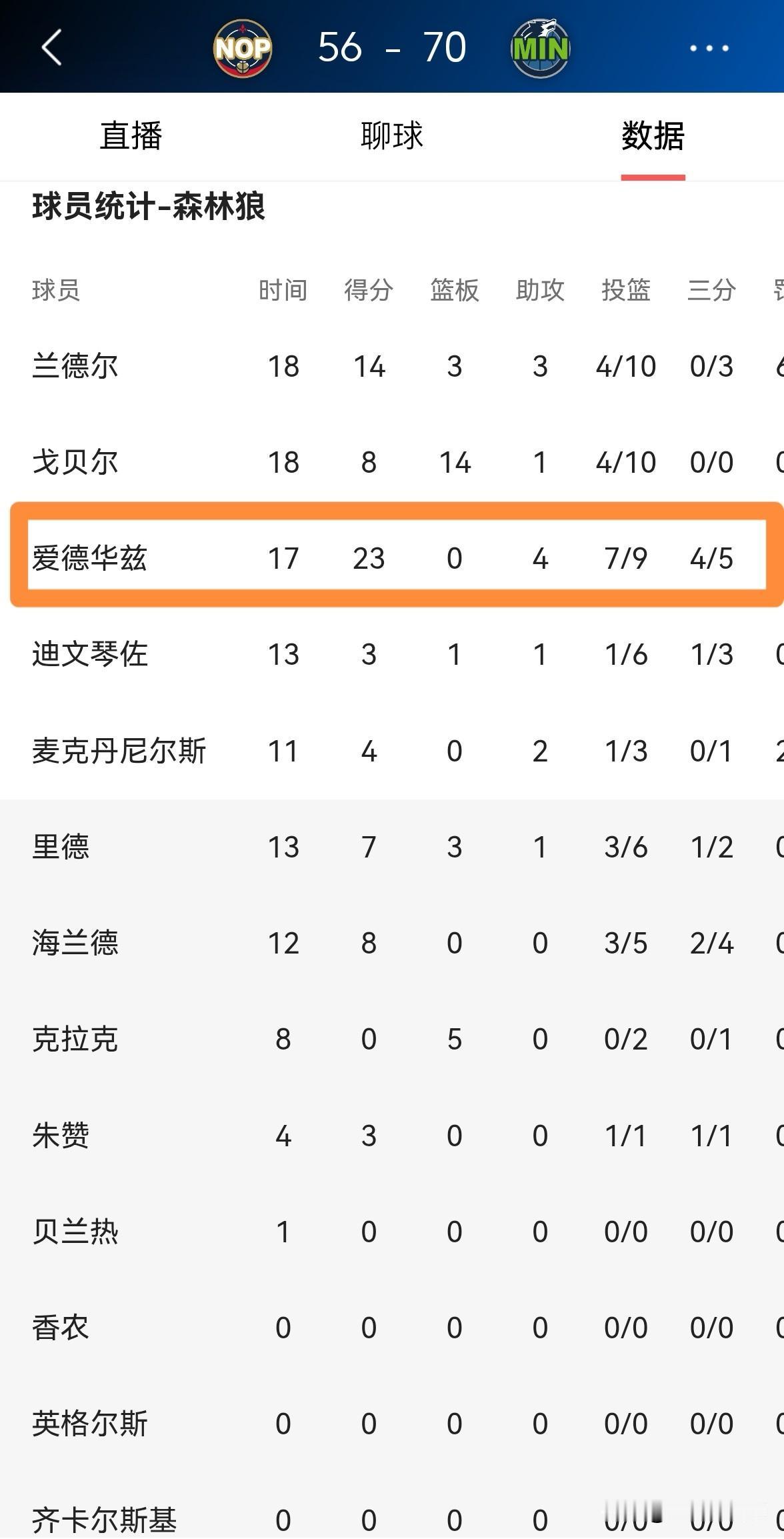 森林狼超级巨星爱德华兹真是强的可怕!在今天森林狼主场迎战鹈鹕的比赛中,目前双方半场战罢,森林狼以70:56领先对手。在前两节比赛中,爱德华兹展现出了超级巨星的能力,他在进攻端完全是无可阻挡。 在上半场比赛中,爱德华兹首发出战17分钟,投篮9中7,其中三分球5中4、罚球5中5爆砍23分,还有4助攻,没有出现任何的失误和犯规,他的场上正负值为+7。 坦白说,爱德华兹不愧是当今联盟最强得分手之一,当他状态火热的时候,得分对于他来说简直易如反掌。