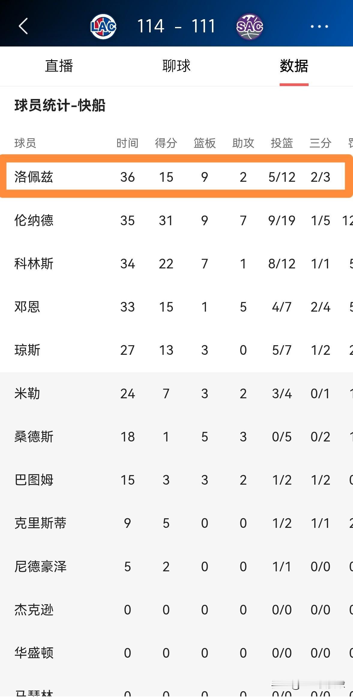 快船老将洛佩兹真是让人感到惊叹!在今天快船客场以114:111力克国王的比赛中,37岁的洛佩兹重新焕发了往日的光彩,他在攻防两端都打出了无可挑剔的表现。 整场比赛下来,洛佩兹首发出战36分钟,投篮12中5,其中三分球3中2、罚球4中3得到15分,还有9篮板2助攻1抢断3盖帽,他的场上正负值为+12。 考虑到洛佩兹已经37岁了,因此他能够在攻防两端打出如此出色的表现,不得不让人感到惊叹。