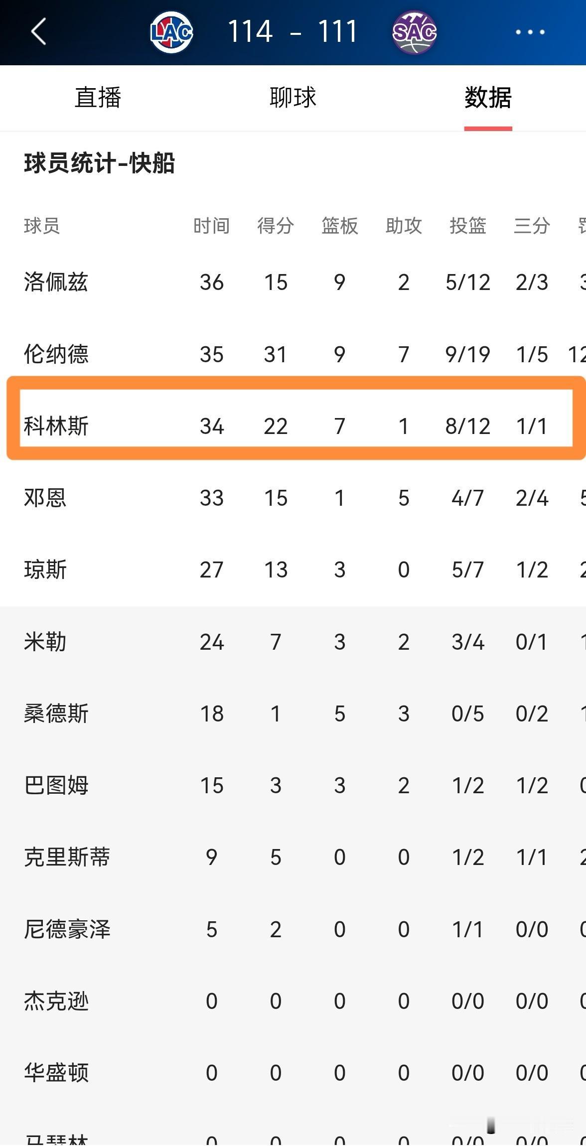 快船大将科林斯真是功不可没!在今天快船客场以114:111战胜国王的比赛中,科林斯堪称球队获胜的大功臣。整场比赛下来,科林斯首发出战34分钟,投篮12中8,其中三分球1中1、罚球5中5非常高效的砍下22分,还有7篮板1助攻2盖帽,仅仅出现了1次失误。 毫不夸张的说,快船之所以能够在缺兵少将的情况下击败国王,科林斯的贡献是非常巨大的,尤其是科林斯在篮下和防守端的表现更是无可争议。