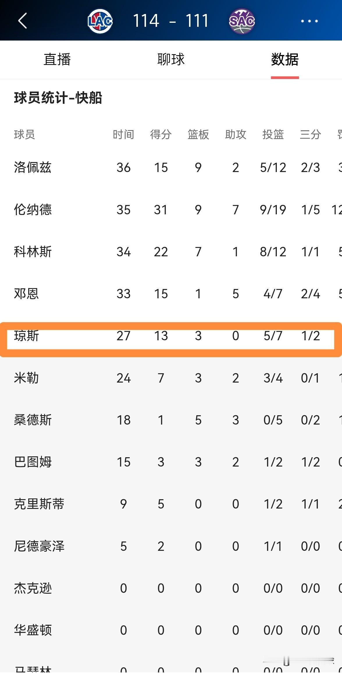 快船悍将小琼斯的状态真是越来越好了!今天快船在客场以114:111险胜国王,此役小琼斯在攻防两端都展现出了越来越好的状态,他在首发出战的27分钟里,投篮7中5,其中三分球2中1、罚球3中2非常高效的砍下13分,还有3篮板2抢断,他的场上正负值为+21。 坦白说,只要小琼斯的状态越来越好,那么快船就完全有可能杀进西部前六,因为小琼斯能够在攻防两端为伦纳德分担非常大的压力。