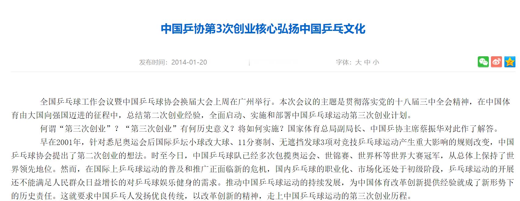 解读中国乒协第三次创业 乒乓球的第三次创业 正好有朋友在问三创是什么,比赛间隙和大家说一下我截取一下关键点:以弘扬中国乒乓文化为核心任务,以开发乒乓球运动的多元功能为出发点,以提升乒乓球运动价值为最终目标,坚持以人为本,深化乒乓球运动管理体制改革,转变发展方式,实现中国乒乓球运动的多元、持续、健康发展,为建设体育强国做出积极贡献。“第三次创业”的奋斗目标是,继续保持乒乓球竞技运动在世界上的领先地位,在奥运会等国际大赛上取得优异成绩,为国争光。引领世界乒乓球运动的发展潮流,推进国际推广计划的实施。不断加大乒乓球市场开发力度,更多地支持和支撑乒乓球事业的发展,大力开展全民健身乒乓球运动,搭建公共服务平台,加强组织建设,发挥协会作用,统筹全民健身活动。======说大白话就是推广乒乓球,不要让乒乓球变得越来越冷门,市场化、国际化。成绩好,商业价值高,双开花。原文地址:网页链接