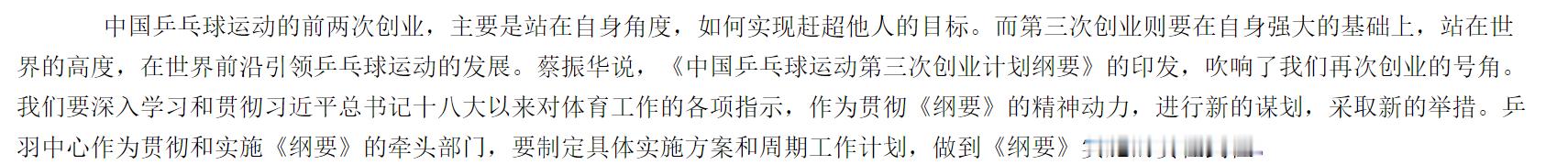 第三次创业:在2012年伦敦奥运会中国乒乓球队包揽全部金牌后正式启动。其核心目标是在保持竞技水平世界领先的同时,推动乒乓球运动的多元化发展和国际化推广,扮演好“全球推广者”的角色=========部分参考网页地址:网页链接网页链接