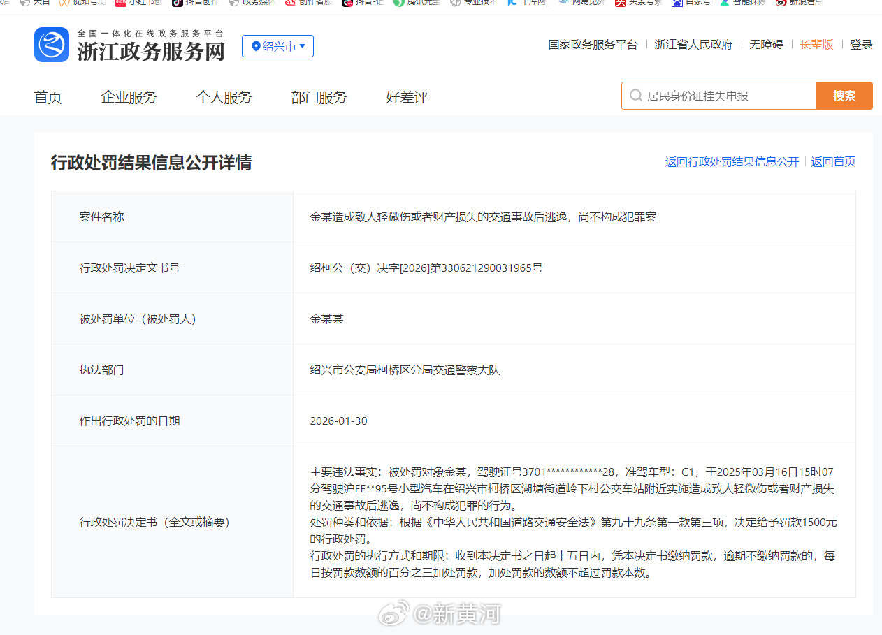 【最新公开 #金晨事故逃逸被罚1500元#】#金晨肇事逃逸不构成犯罪案# 7日,记者在浙江政务服务网查询到肇事逃逸事件处理结果:被处罚对象金某,驾驶证号3701************28,准驾车型:C1,于2025年03月16日15时07分驾驶沪FE**95号小型汽车在绍兴市柯桥区湖塘街道岭下村公交车站附近实施造成致人轻微伤或者财产损失的交通事故后逃逸,尚不构成犯罪的行为。处罚种类和依据:根据《中华人民共和国道路交通安全法》第九十九条第一款第三项,决定给予罚款1500元的行政处罚。行政处罚的执行方式和期限:收到本决定书之日起十五日内,凭本决定书缴纳罚款,逾期不缴纳罚款的,每日按罚款数额的百分之三加处罚款,加处罚款的数额不超过罚款本数。