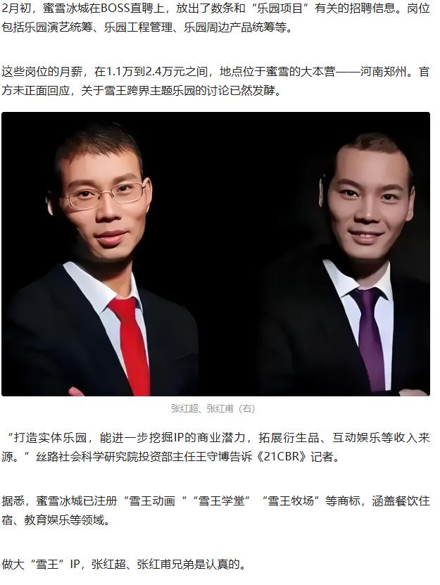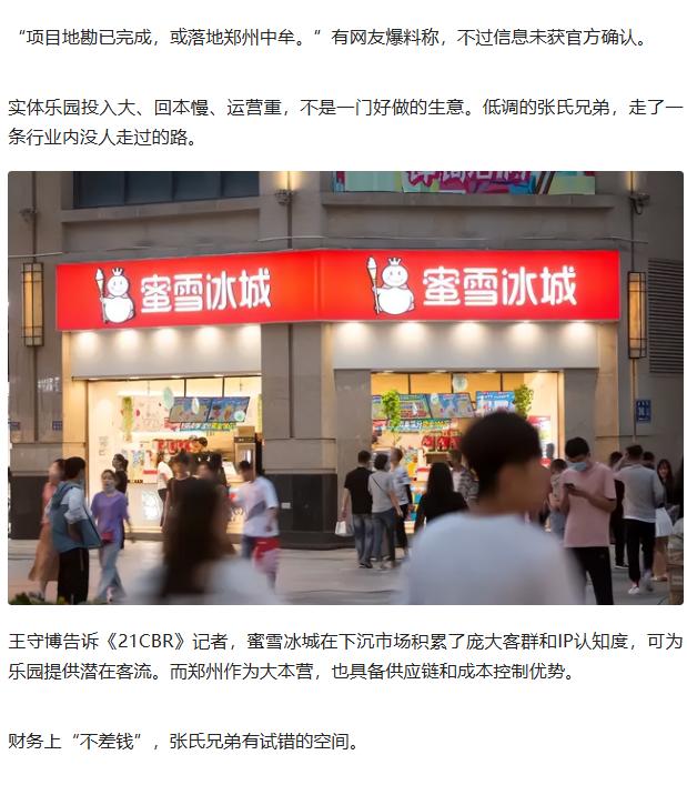 国内最舍的花钱一族是青少年、儿童。蜜雪冰城瞄准的市场主要就是青少年、儿童,现在兄弟俩把目标瞄准了游乐项目,也是一个很好的想法,不仅儿童、青少年愿意去,同时也带动了父、母及银发一族陪同前往体验。 但是把首个大型项目放在郑州中牟,这个决定有立足本地的考量但是也很冒险,郑州虽然是枢纽城市,交通便利,但是相比北京上海广州一线城市,在客流和消费能力上,还是有差距。 更重要的是,这是绝对大跨界,不是自己熟悉的领域,从头开始要交不少学费。 不过雪王有钱,倒也不怕···
