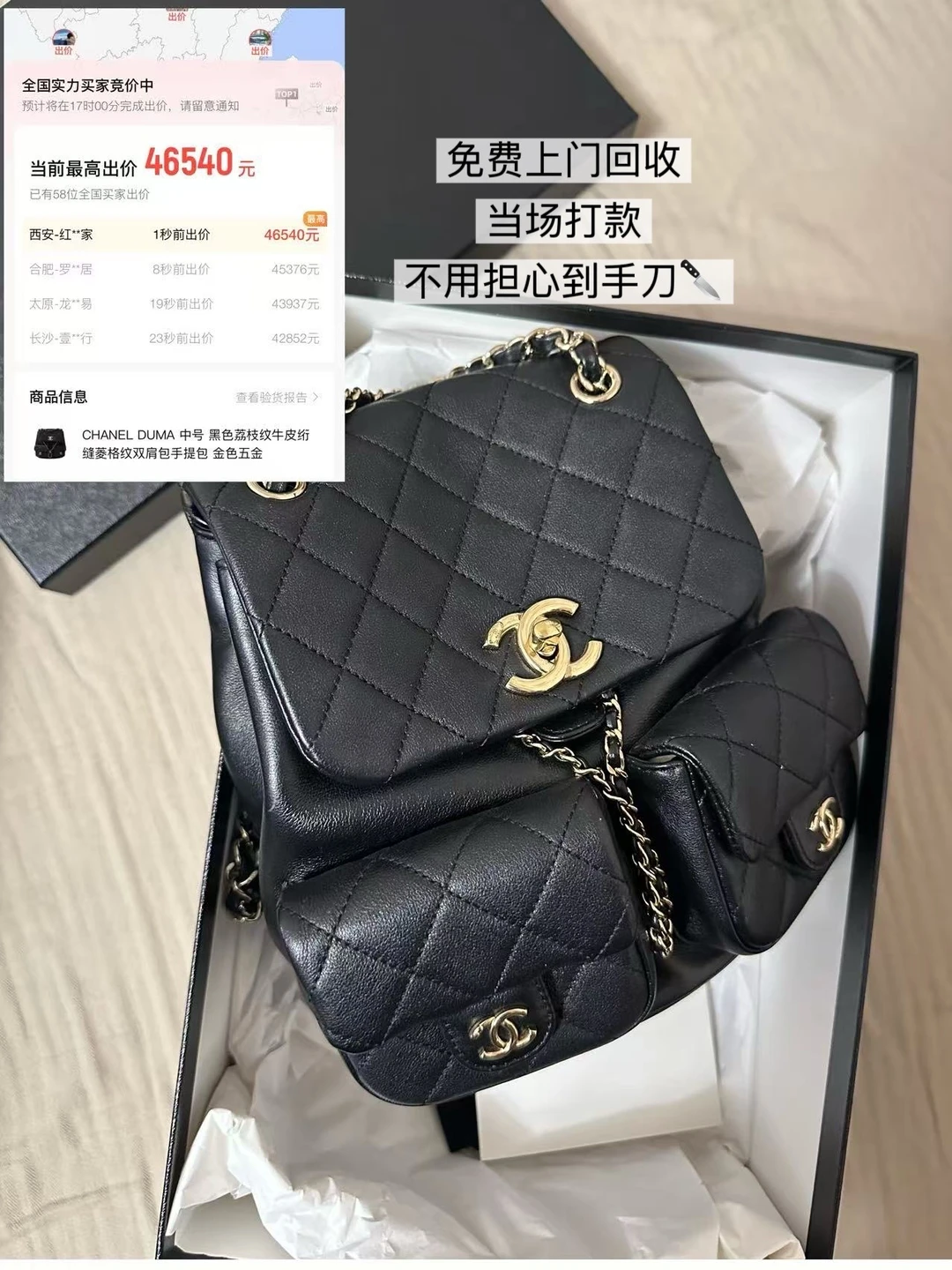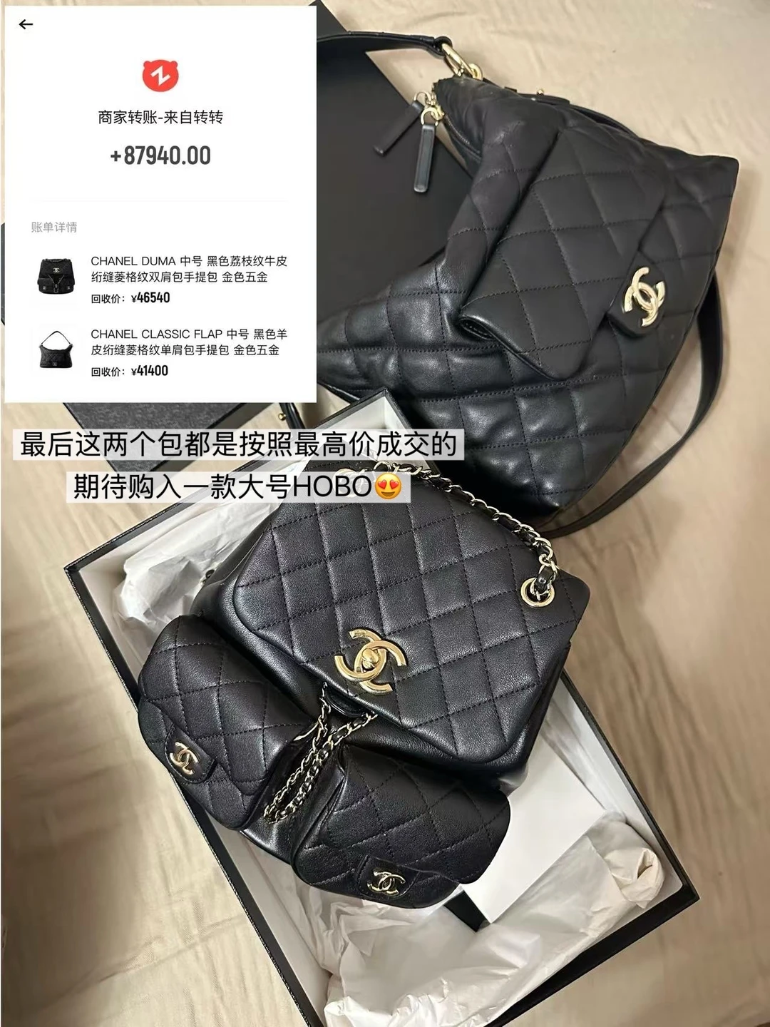 姐妹们,前段时间收拾出来了2个闲置的包包,想出掉很久了,之前一直担心二手奢侈品回收流程复杂、估价不透明,但这次转转上门回收的体验彻底打消了我的顾虑。家里两只闲置的包包——23B Hobo 和 香奈儿 Duma,都成功高价出手:Hobo 卖了四万多,Duma 更是接近五万,比预期高出不少!