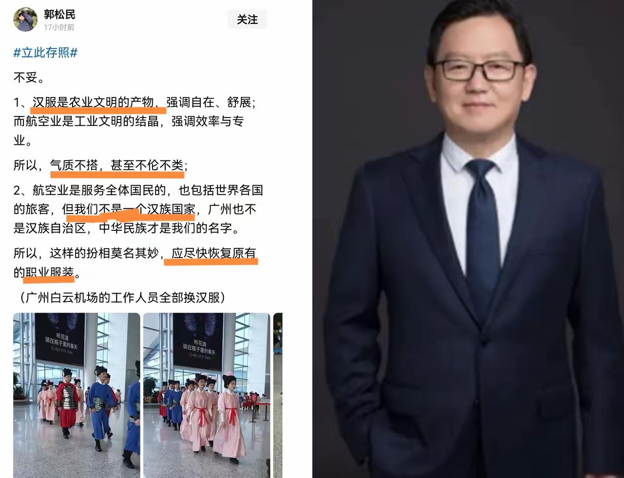 白云机场工作人员穿汉服竟引不满?郭先生这波质疑实在没道理,穿汉服展国风本是美事,何必吹毛求疵,中华传统文化的展现,从来都不该被无端指责! 中华文明本就融工农商于一体,陶瓷、丝绸这些老祖宗的智慧本就是独有的工业文明,何来穿汉服就背离现代的说法?汉服气质好不好本就见仁见智,郭先生凭什么随意评判,况且机场的工作效率自有管理人员监督,轮不到外人指手画脚。我们都是中华民族的一份子,56个民族同根同源,展现汉民族的传统服饰,本就是文化自信的体现,这跟民族认同根本不冲突。 白云机场的汉服本是改良款,窄袖轻便适配工作,更是借春运传扬宋韵文化,既接地气又有内涵。文化传播本就该多元包容,别让无端的质疑,凉了传承传统文化的心。你觉得白云机场穿汉服的做法,是不是超有意义?