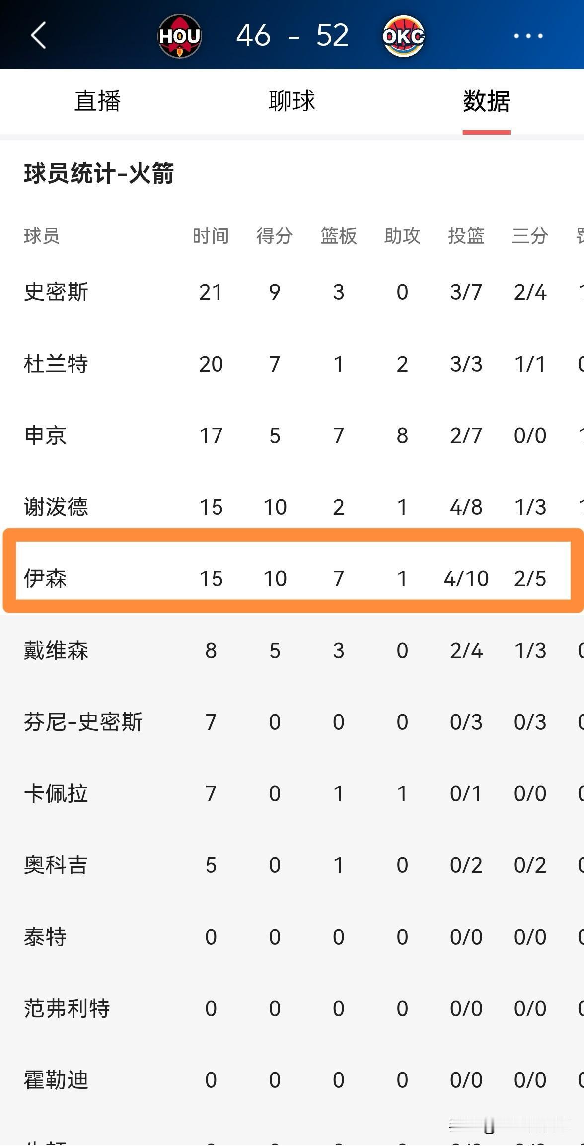 火箭大将伊森真是太把自己当回事了!在今天进行的火箭和雷霆的比赛中,目前两队的上半场比赛已经结束,火箭以46:52落后对手。在前两节比赛中,伊森俨然把自己当成了球队的头号球星,他在首发出战的15分钟里,投篮10中4,其中三分球5中2得到10分7篮板1助攻1抢断,他的场上正负值为+4。 值得注意的是,在上半场比赛中,伊森的出手数高居全队第一,伊森真是太把自己当回事了。