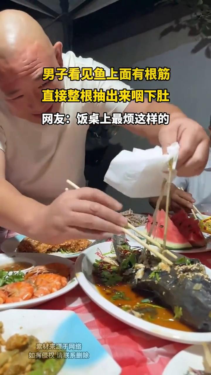男子看见鱼上面有根筋,直接整根抽出来咽下肚。网友:饭桌上最烦这样的。 素材来源于网络,如有侵权请联系删除。发布时间:(2月6号)。
