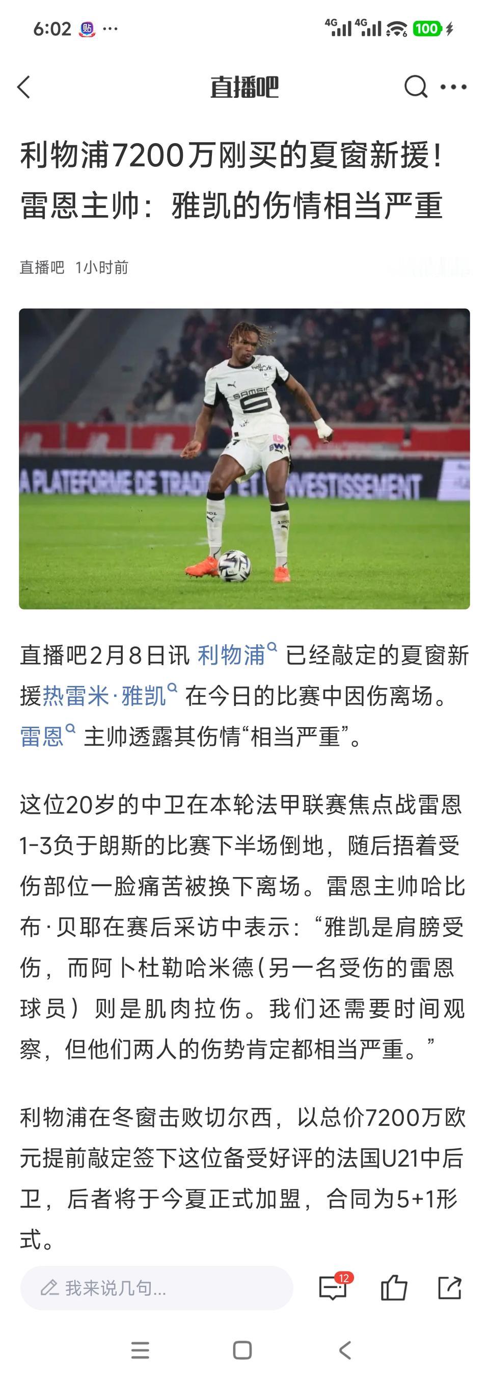 利物浦不应该提前买球员!! 凯雅7000万买了,暂时还在法甲踢球,人家当然能用几天往死里使用,结果受伤。 利物浦本来就缺后卫,还没来呢,又来一个病号,等于白买,浪费7000万。 感觉利物浦有钱了,反而不会花![可怜]